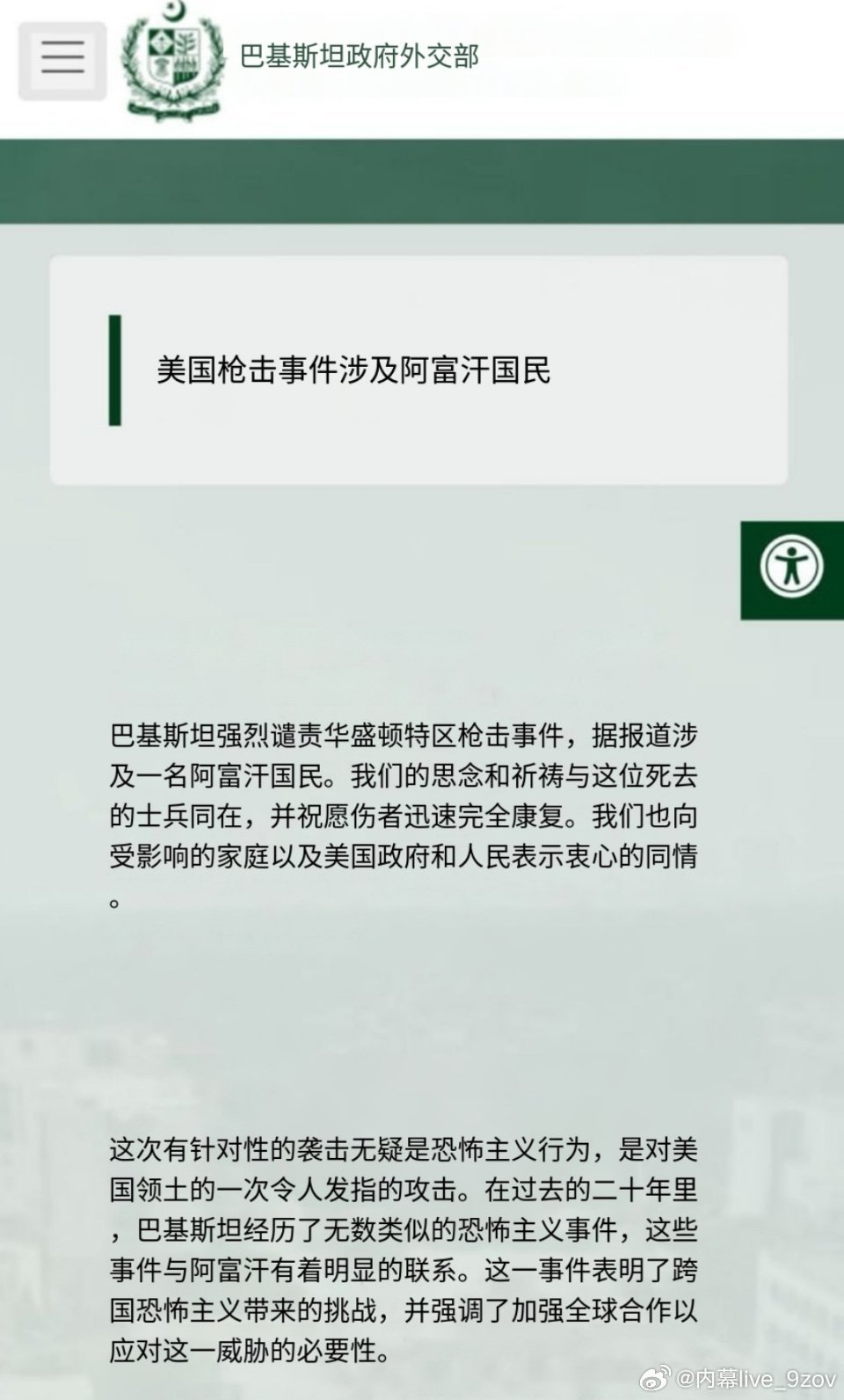 最新消息: 巴基斯坦外交部发布声明,强烈谴责发生在华盛顿特区的枪击事件。