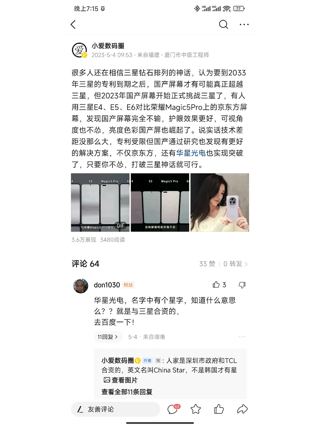 2023年手机屏幕排名,三星第四,苹果第二都不如国产屏幕,前几天发文说了国产屏幕起来了,很多人并不信,但这又有排行榜来了,第4名三星S23Ultra,第三名iPhone14Pro,第二名iPhone14ProMax,第一名则是荣耀Magic5Pro。事实上国产屏幕在护眼效果、可视角度和亮度方面相对于三星屏幕来说更有优势,不知道大家用没用过国产屏,我用了好多款,实际的感受确实是这样,2023年国产屏幕不输国外产品,这是我的结论。大家用的什么型号的手机,你觉得你手机的国产屏幕是超越三星了吗?