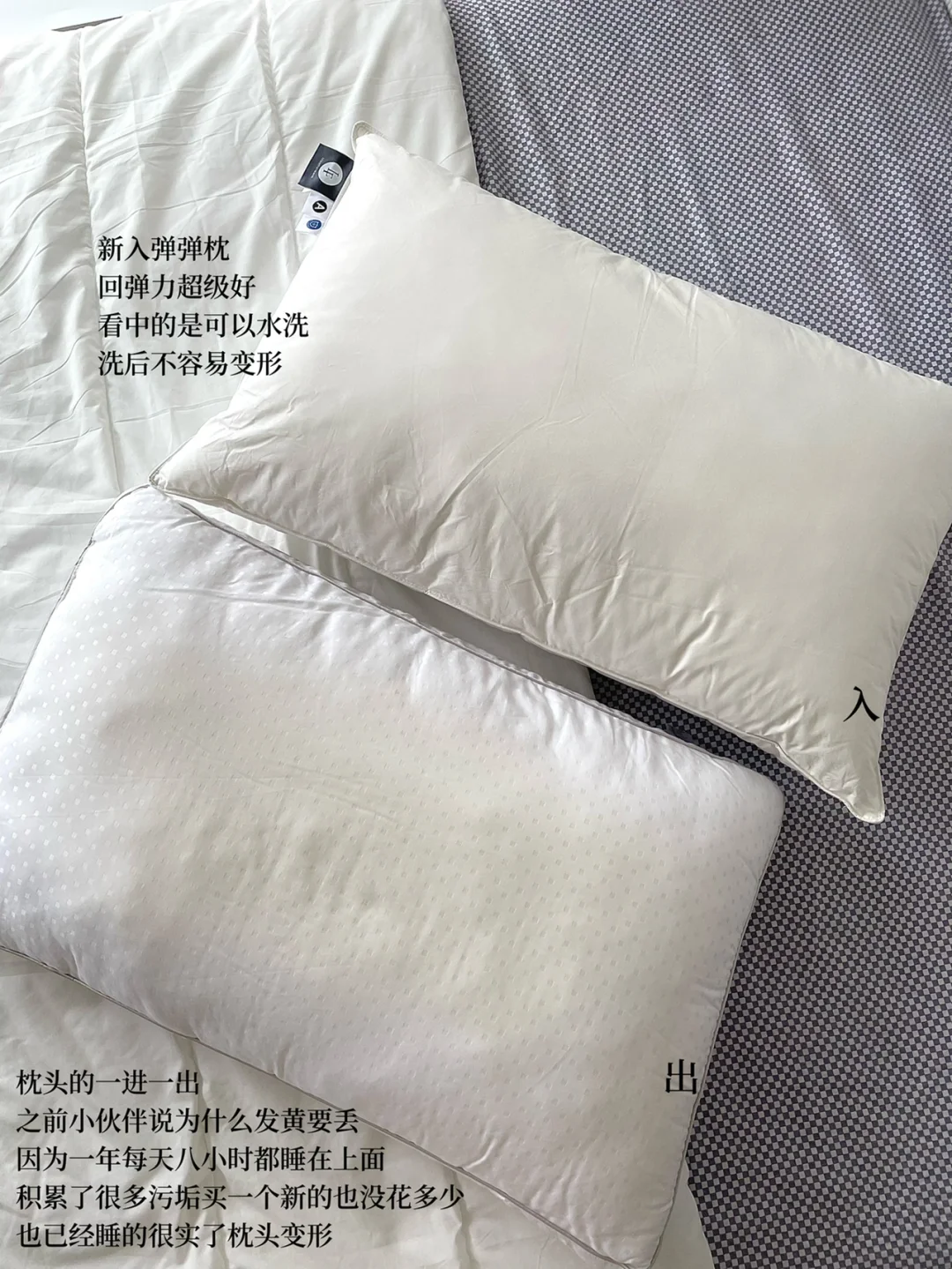 新入:一个弹弹枕。我需要可以直接丢洗衣机洗并且不容易变形,新入的枕头满足了我,睡下去刚刚好的柔软,我打算不套枕套,就把它安置在次卧里啦~