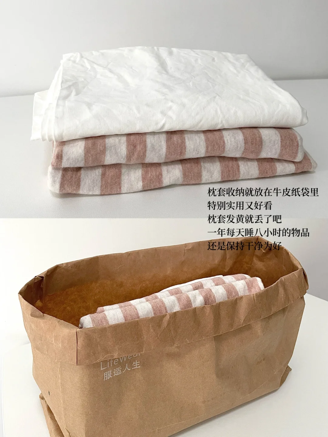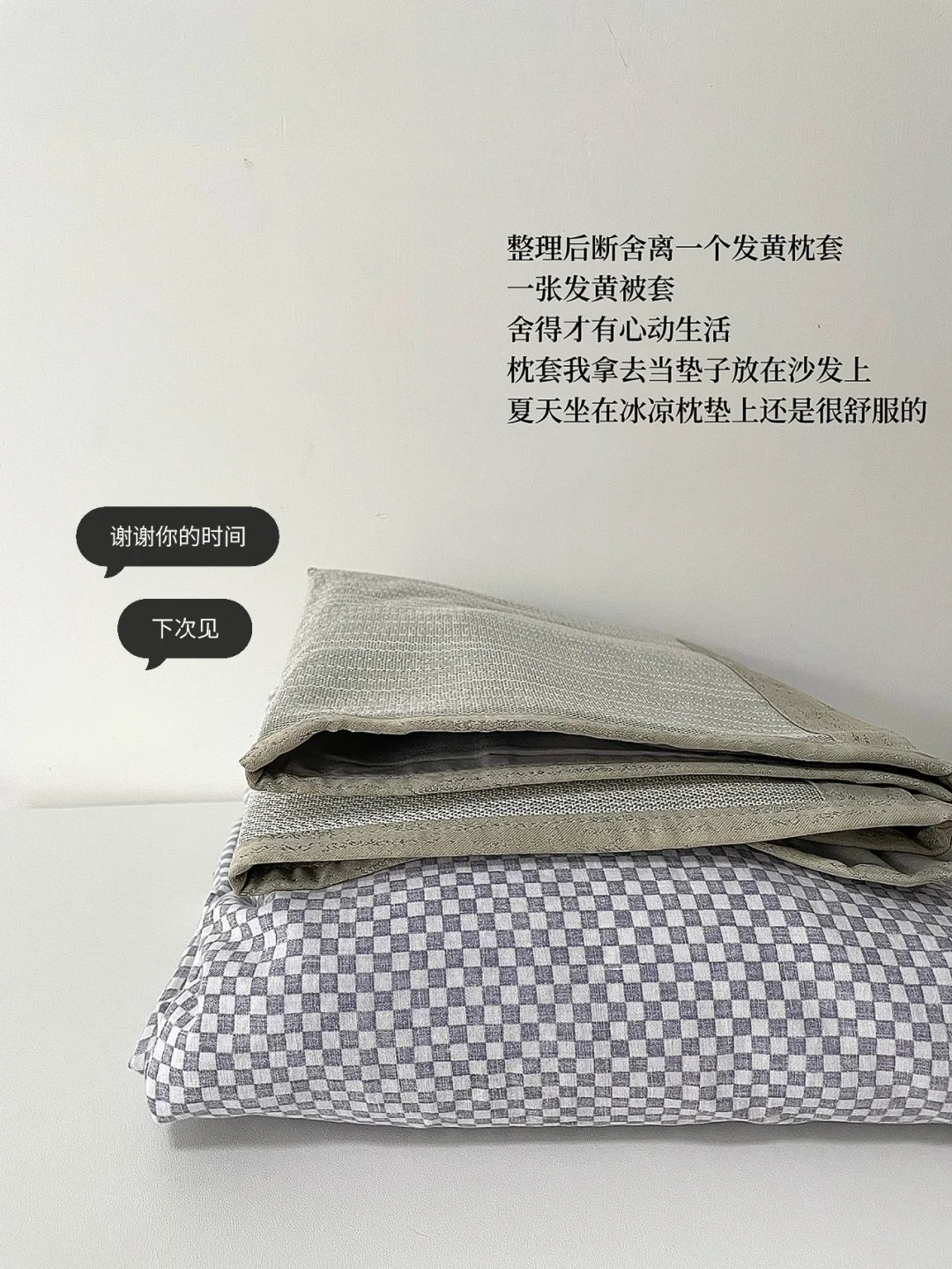 定期对自己的的床品进行重新评估,把旧的、发黄的、变形的统一断舍离吧。