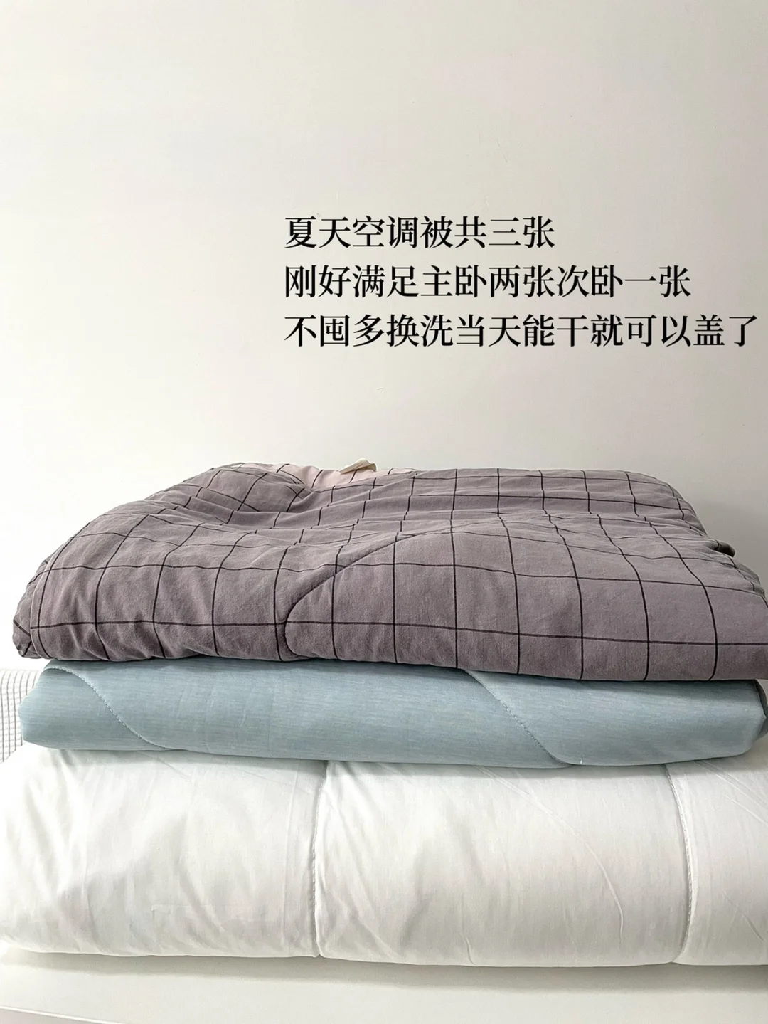 这里好好审视我主卧和次卧的床品,夏天保持清爽为原则,主卧一直用一张凉席、两个冰丝凉枕套、两张空调被,足够。