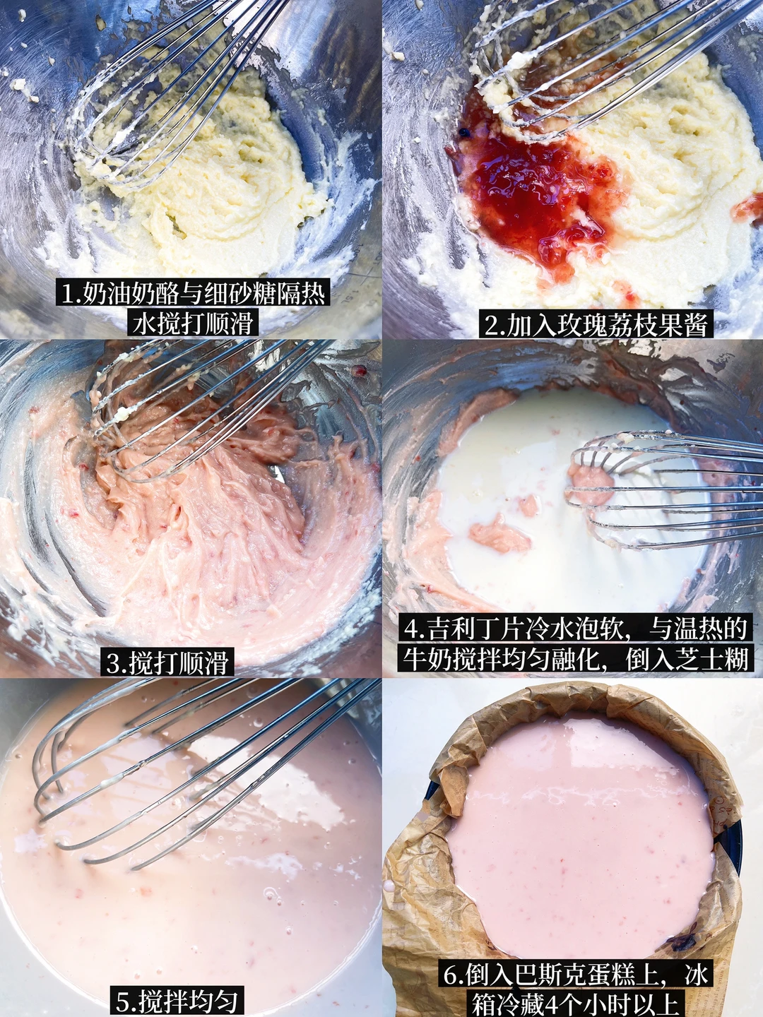 ▪️玫瑰慕斯:奶油奶酪100g 牛奶150g 吉利丁片10g 细砂糖20g 玫瑰荔枝果酱60g