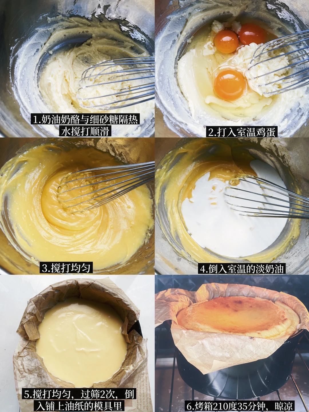 1️⃣奶油奶酪与细砂糖隔热水搅拌顺滑,依次加入鸡蛋和淡奶油搅拌均匀,再筛入玉米淀粉,翻拌均匀。过筛2次以后倒入6寸模具。