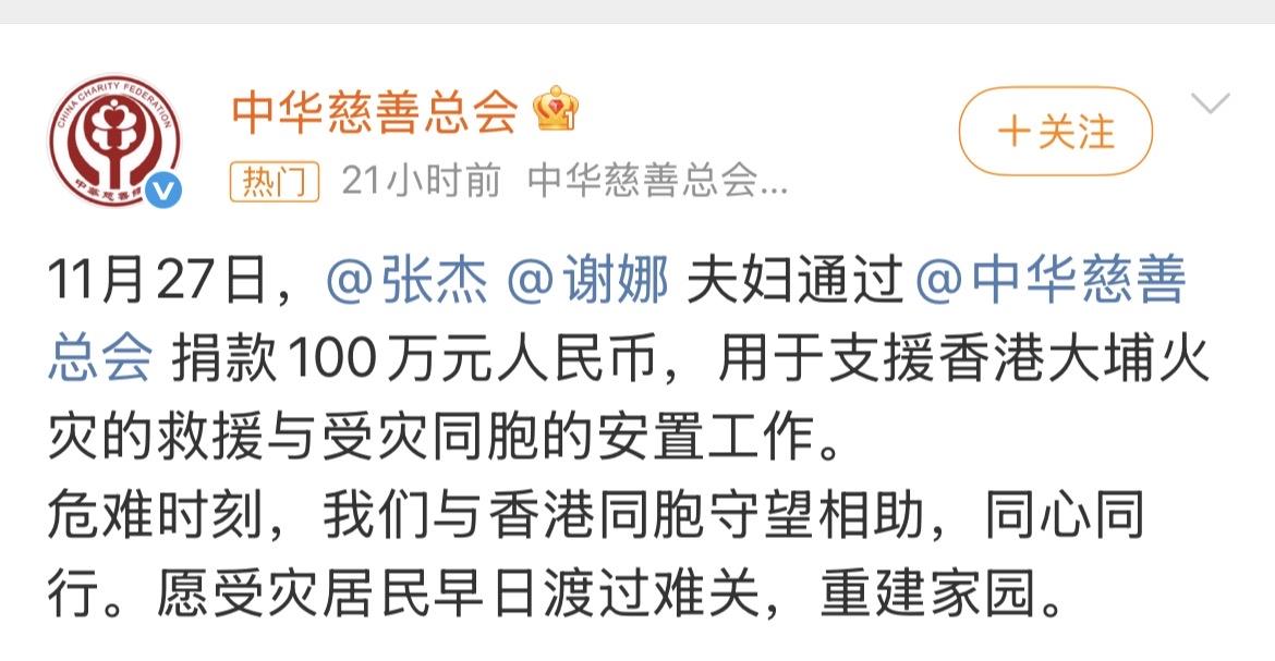 张杰和谢娜这对夫妻,真是越了解越让人佩服。哪儿都好,就是做事太低调——给香港火灾捐了100万,居然还是慈善机构发公告,大家才知道。 以前何炅在节目里吐槽谢娜,说她买个东西能纠结半小时,一到买单就“失踪”,大家都以为她挺抠门的。没想到这次一出手就是百万,还是默默捐的,不宣传不炒作。 这才明白,原来他俩不是抠,是把钱花在了该花的地方。对自己日常精打细算,遇到大事却毫不含糊,默默承担起明星的社会责任。这样的低调和担当,或许正是他们能一直拥有高国民度的真正原因吧。