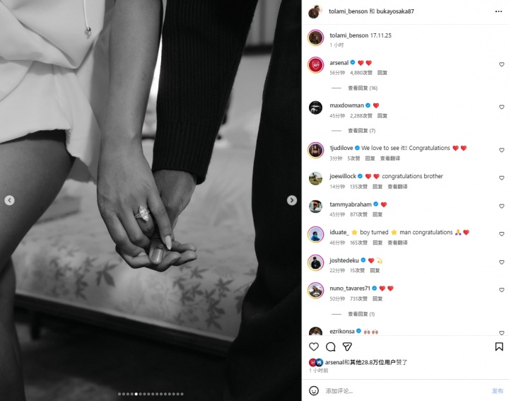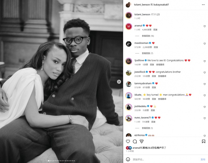 这则帖子也得到了萨利巴、加布里埃尔、埃泽等队友以及阿森纳官方的评论祝贺。