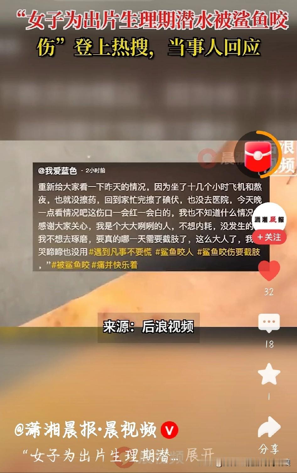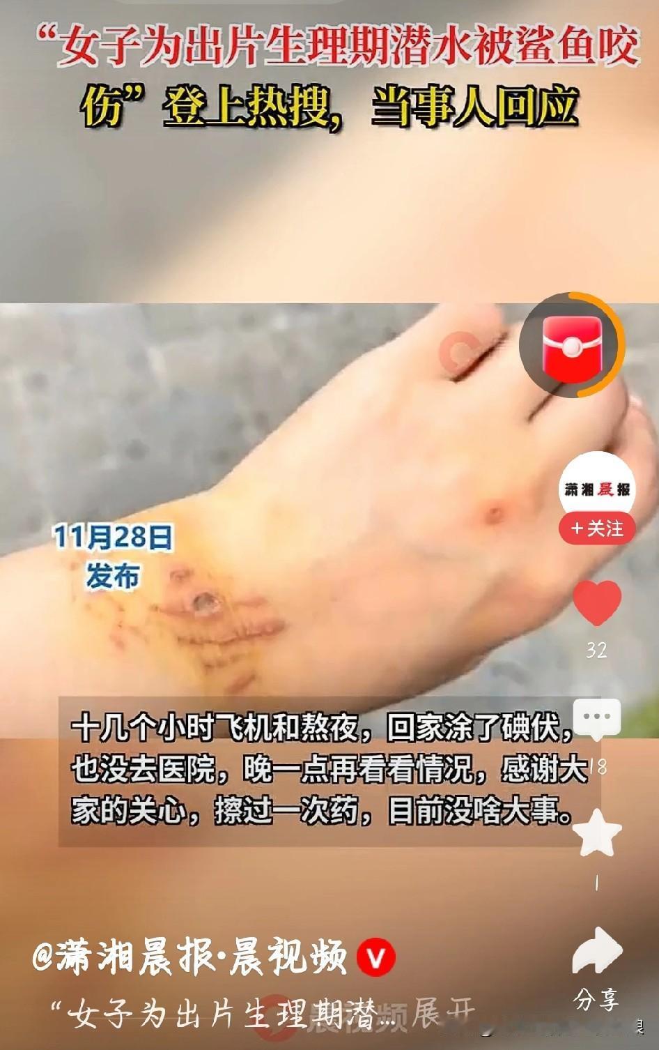 女子生理期在马尔代夫潜水被鲨鱼咬,还一脸不在乎,这操作太让人费解了! 明知自己生理期,偏要下水就算了,还追着护士鲨玩,伸手去摸。鲨鱼被惹急回头咬了她手腕,伤口渗血又青紫,她居然笑着炫耀,说像蚊子叮。 生理期下水本就容易遭细菌感染,妇科疾病找上门,血腥味还会吸引鲨鱼。海水里的创伤弧菌多吓人,感染了可能截肢,真不是开玩笑。 野生动物再温顺也有底线,大自然更没道理惯着任性。旅行是放松,不是拿命博眼球,敬畏规则、爱惜身体才是真的酷。 你觉得她这行为是勇敢还是无知?评论区聊聊~女子回应生理期潜水被鲨鱼咬伤 潜水 生理期 图片截图于潇湘晨报晨视频