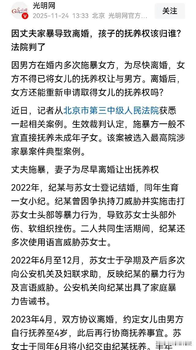 北京苏女士的这起案件,折射出家庭暴力与子女抚养权争夺背后复杂的法律与人性纠葛,也将引发社会对弱势群体保护的深刻思考。 婚后遭遇丈夫威胁殴打的苏女士,在忍无可忍的情况下选择离婚,但为了尽快脱离痛苦,她无奈将女儿的抚养权让给了前夫。离婚后的现实却让她心碎——前夫并没有尽到应有的照顾责任,甚至影响了孩子的身心健康。母亲本能的保护欲和对女儿未来的担忧,促使她“带走”了孩子,却因此遭到前夫提出的人格权侵害禁令。 面对这样的局面,苏女士走上了诉讼之路,要求法院重新判定女儿的抚养权。那么,法院会如何判? 1. **法理依据:孩子最大利益原则优先**中国婚姻法和相关司法解释明确,以保护未成年子女的合法权益和身心健康为最高原则。法院在判断抚养权归属时,最核心的是“谁对孩子的成长更有利”。 2. **家庭暴力加重前夫失责风险**丈夫对苏女士的暴力行为是不可忽视的严重因素,这不仅影响夫妻间的关系,也会被法院视为不利于孩子健康成长的环境。若前夫不能提供良好的生活照顾和精神关爱,法院极有可能认为其不具备抚养资格。 3. **前夫申请的人格权侵害禁令有待审慎核实**禁止他人侵犯人格权固然合理,但若前夫用此作为阻挡母亲与孩子相处的手段,且未能有效履责,则法院可能不会采纳该禁令作为干涉抚养权的理由。 4. **社会各界重视母亲保护权利助力判决**随着对家庭暴力认识的提升,司法保护家庭暴力受害人权益的力度加强,母亲维护子女权益的诉求更易获得同情和支持。 **总结看点:**苏女士的诉求符合法律对于未成年人利益的保护原则。如果她能充分证明前夫未尽到抚养义务,甚至影响女儿健康成长,法院大概率会重新判定抚养权归母亲。法律并非冷冰冰的条文,而是保护弱者、守护亲情的有力武器。 这起案件提醒我们,家庭暴力的阴影不仅伤害了受害人自身,更深刻影响未成年人的成长环境。社会与法律都应携手为受害者撑起保护伞,让更多像苏女士一样的母亲和孩子,能够找到真正的安全和温暖。 家庭暴力 家庭暴力的案子