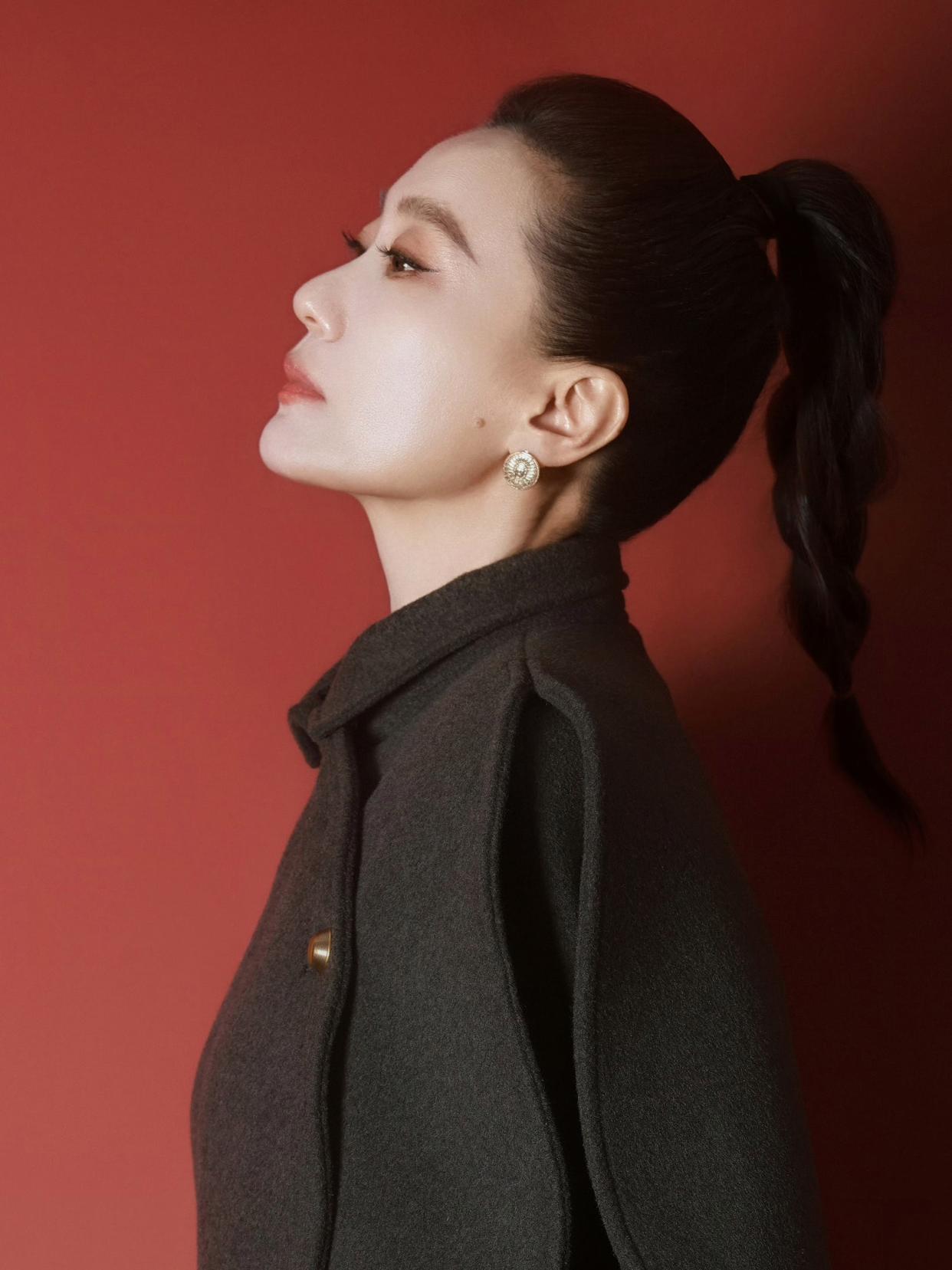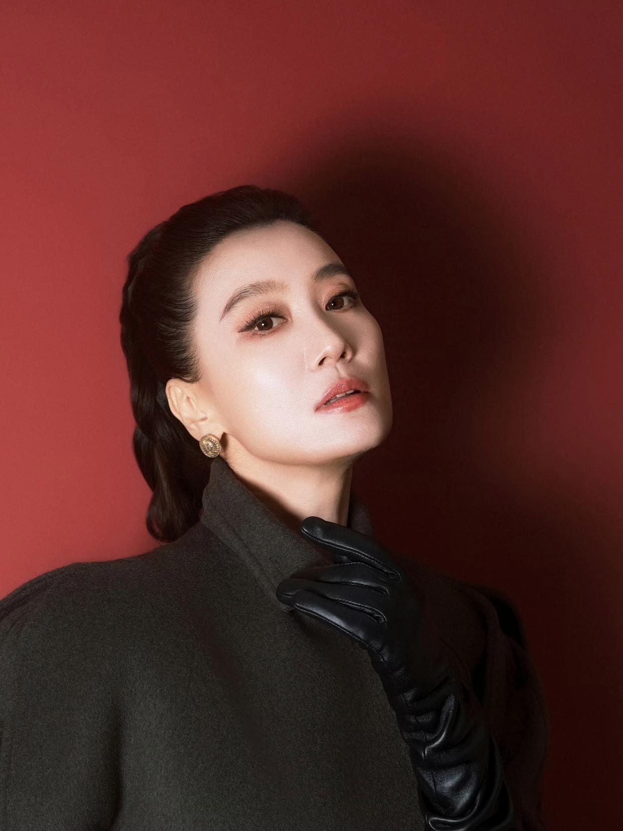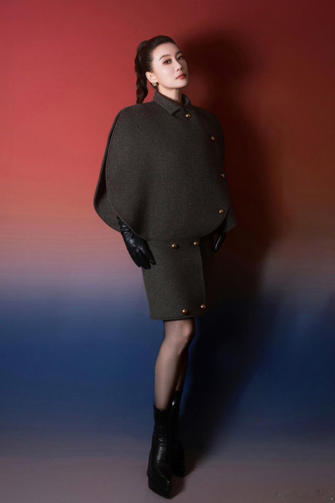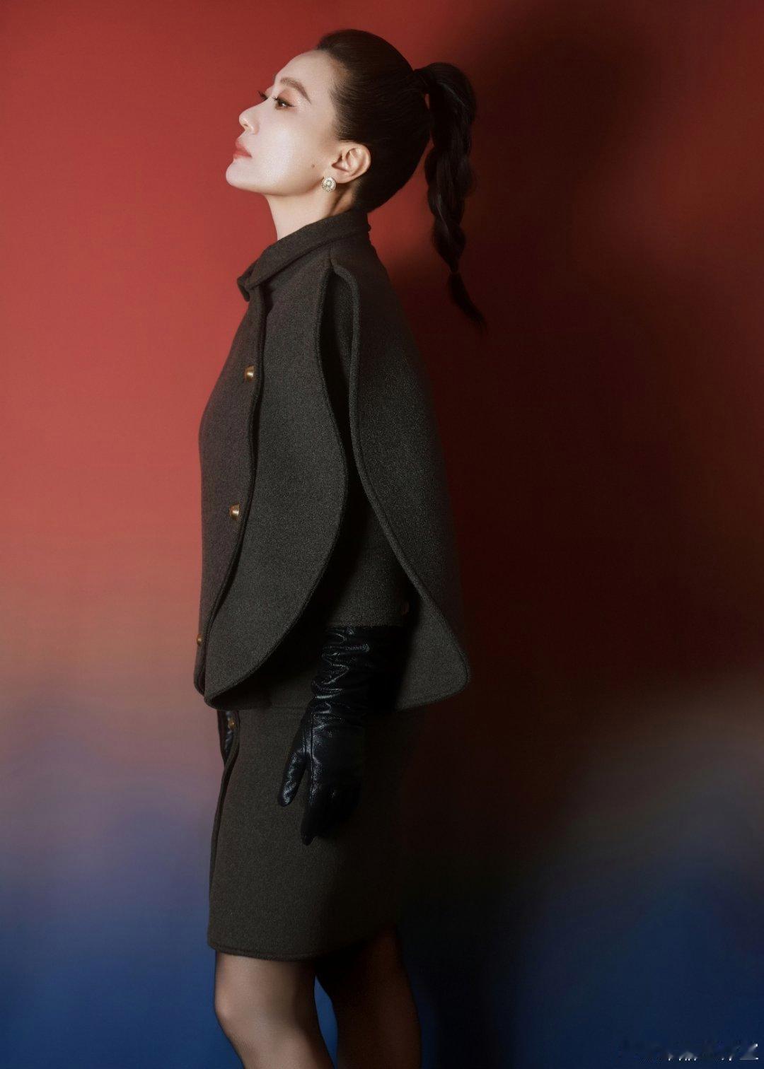 谭晶扛住这深橄榄绿斗篷+黑皮手套的组合啊——斗篷的廓形自带气场,金色纽扣是贵气的点睛之笔;长款黑皮手套裹住手臂,冷冽又精致,和编发马尾的利落感撞得刚好。
