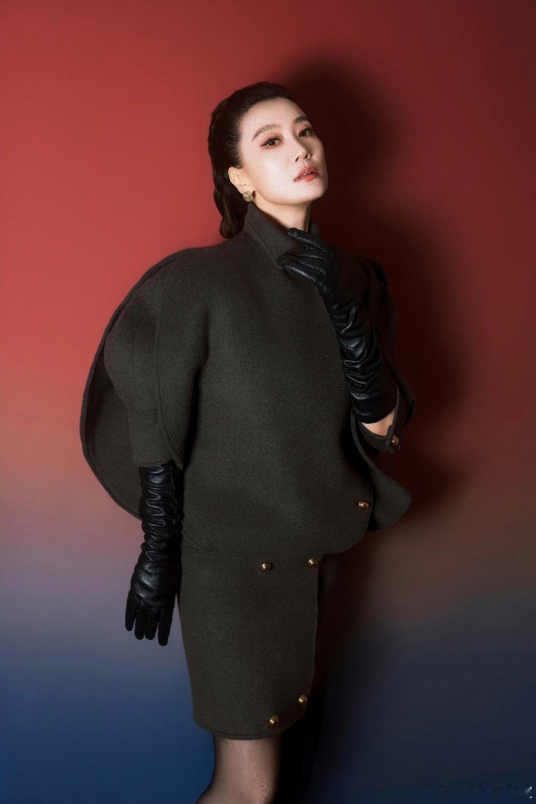 谭晶扛住这深橄榄绿斗篷+黑皮手套的组合啊——斗篷的廓形自带气场,金色纽扣是贵气的