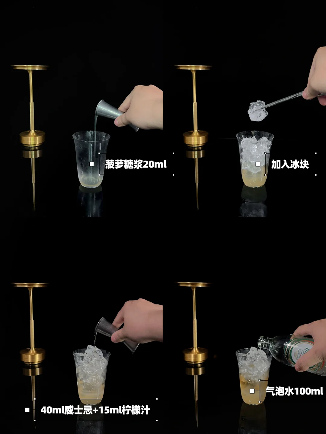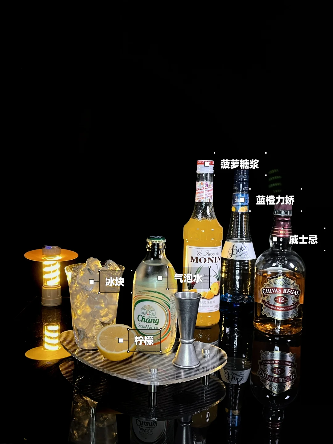 “月亮与六便士”气泡口感 口感醇厚,充满果香,威士忌的热烈与气泡水的清新交织在一起,底部的菠萝糖浆和顶上的蓝橙力娇 犹如月亮与六便士,在现实与理想之间游走,搅拌交融开来碰撞寻觅内心的答案。