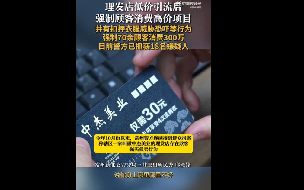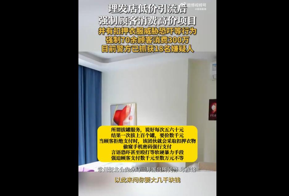 疯狂抢钱到肆无忌惮的地步! 受害群众达70多人,其间没有报警的吗? 今年 10 月起,常州中杰美业理发店以 “30 元体验 4 次美容美发” 引流,进店后借拔罐等项目强推高价服务(一次拔百罐要数千元),拒付则扣衣物、逼密码、恐吓殴打。 警方抓获 18 人,查证 70 余名受害者,涉案 300 万元。 这理发店把 “宰客” 玩成了 “强盗剧本”! 30 元体验是 “钓鱼钩”,百个拔罐是 “杀猪刀”,扣衣服、逼密码、还动手,一套操作比 “黑店” 还黑,赚黑心钱赚得眼睛都红了。 网友说被搞过两次,现在怕进陌生店,可见这套路坑了多少人。 店家怕是把 “顾客是上帝” 忘到九霄云外,满脑子都是 “不掏钱别想走”。 好在警方出手快,把这伙人端了,不然还得有更多人遭殃。 以后见着 “低价体验” 可得多留个心眼,别被小便宜勾了魂,不然进了店可能就成了 “待宰的羔羊”,踏踏实实选熟悉的店,总比踩坑强! 理发店低价引流后强制消费高价项目