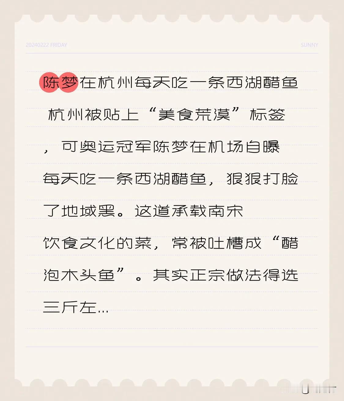 陈梦在杭州每天吃一条西湖醋鱼 杭州被贴“美食荒漠”标签 奥运冠军陈梦机场自曝 在杭每天吃一条西湖醋鱼 狠狠打脸地域黑 这道菜承载南宋饮食文化 却常被吐槽“醋泡木头鱼” 正宗做法选三斤左右草鱼 经“饿养吐泥”处理 鱼肉有蟹肉鲜甜 楼外楼老师傅改良版本 鱼冻回甘超赞 除传统西湖醋鱼 杭帮菜也有创新 桂花鳖烧羊 用桂花酒炖煮甲鱼和羊肉 去腥膻还融入桂花香 杭州美食众多 评判勿靠刻板印象 需亲自体验 陈梦 陈梦巴黎封后 陈梦世锦赛 陈梦迪奥造型