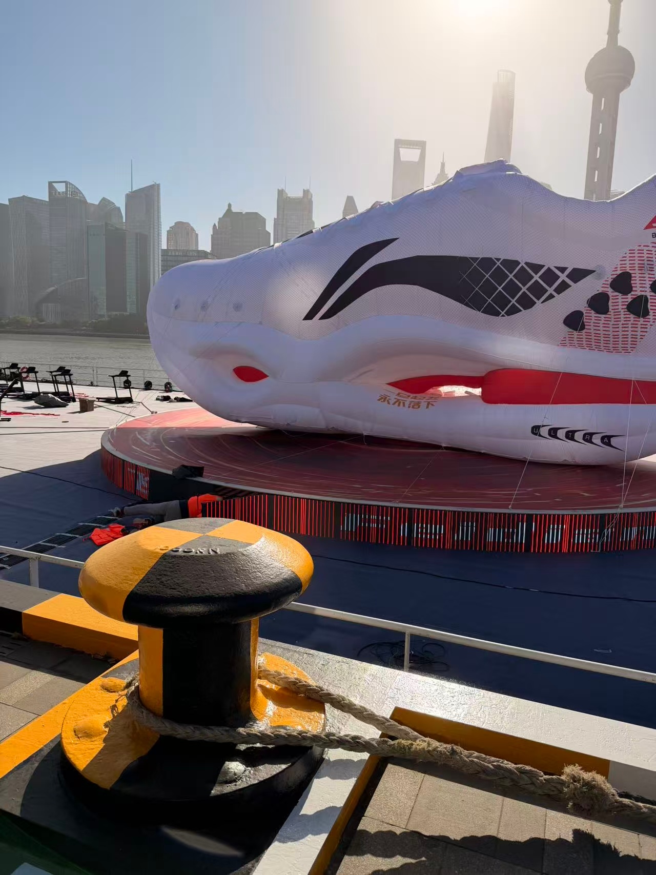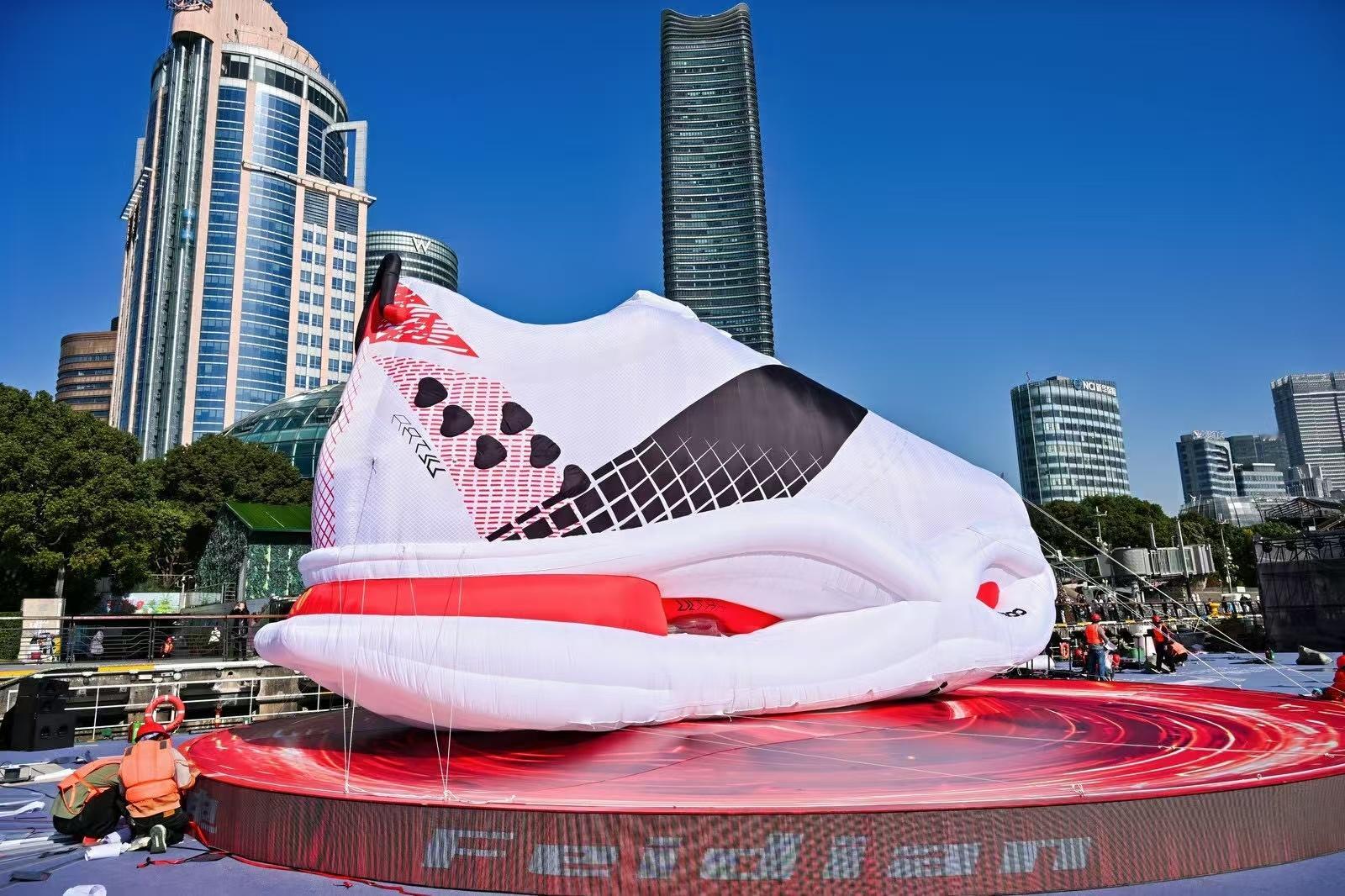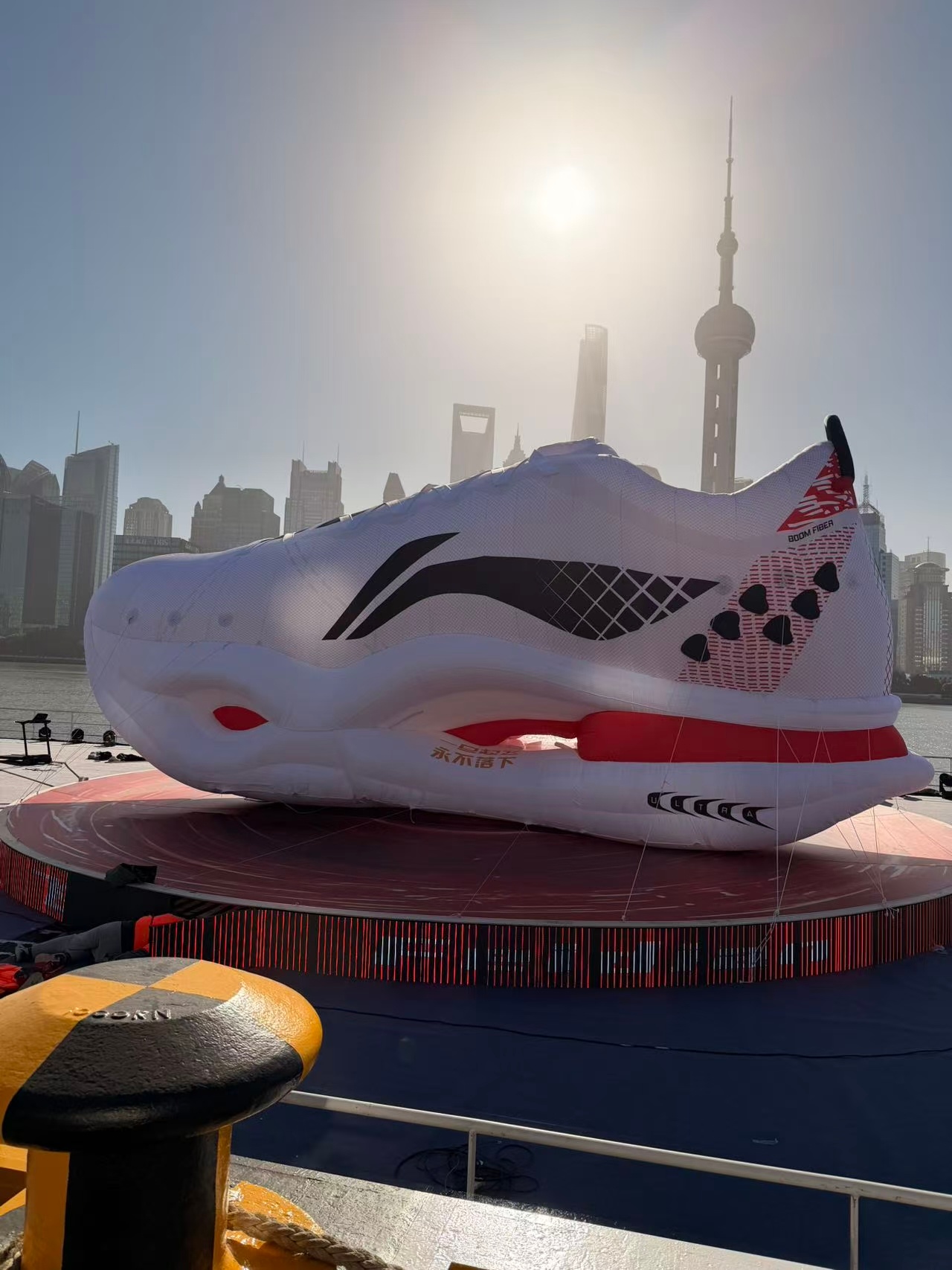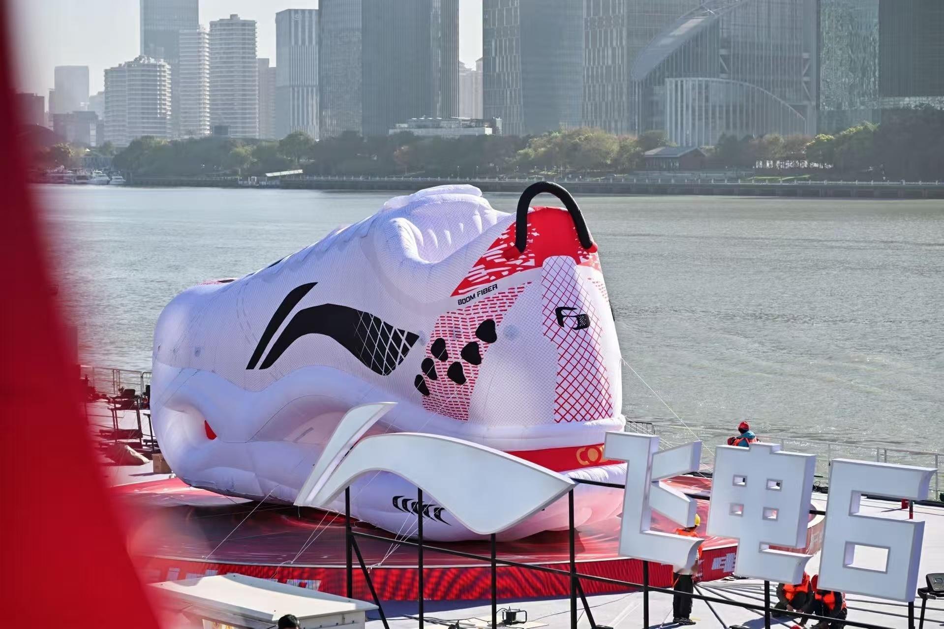 上海黄浦江惊现一只巨鞋与上海共前行,李宁用“北外滩巨鞋”诉说敬意。这独特装置是运