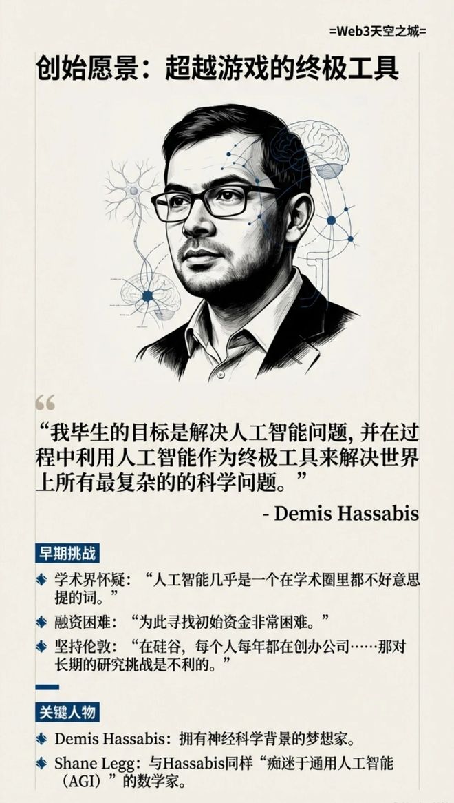 在伦敦国王十字区的一座充满未来感的建筑里,一场关于人类命运的赌局正在悄然展开。这里是DeepMind的总部,也是当代最雄心勃勃的科学实验中心。对于创始人戴密斯·哈萨比斯(DemisHassabis)而言,无论是早年作为国际象棋神童的博弈,还是后来在游戏开发领域的探索,都不过是通往终极目标的序章。DeepMind的故事不仅仅是一家科技公司的成长史,它是人类试图通过构建通用人工智能(AGI)来超越自身认知极限的缩影。从最初被学术界视为边缘学科,到被谷歌收购获得无限算力;从AlphaGo击败李世石引发的全球AI军备竞赛,到AlphaFold破解困扰生物学界半个世纪的蛋白质折叠难题,DeepMind始终在践行着哈萨比斯那个听起来近乎狂妄的使命:“解决智能问题,然后用它去解决其他所有问题。”这篇深度报道将带您走进DeepMind的核心,回顾他们如何利用游戏作为AI的训练场,如何在遭受质疑中坚持基础科学研究,以及面对即将到来的AGI时代,这群顶尖科学家对于技术伦理与人类未来的深刻反思。"我毕生的目标是解决人工智能问题,并在过程中利用人工智能作为终极工具来解决世界上所有最复杂的科学问题。我认为这比互联网更宏大,比移动技术更宏大,它更像是电力的出现或火的发明。""如果大能解决蛋白质折叠问题,那么解决阿尔茨海默病、痴呆症和药物研发等问题的潜力是巨大的。解决疾病很可能是我们能产生最重大的影响。""对中国而言,AlphaGo是警钟,是‘斯普特尼克时刻’。它引发了一场人工智能太空竞赛。""我们不应该采用‘快速行动,打破常规’的方式。因为你不能在打破东西(如文明)后再去修复它们。""通用人工智能(AGI)的出现将把人类历史划分为两个部分:在那之前的部分,和在那之后的部分。""解决智能,再用它解决一切":DeepMind的疯狂愿景故事的起点往往伴随着不被理解的孤独。在DeepMind成立之初,人工智能在学术界几乎是一个令人避之不及的词汇。哈萨比斯和他的联合创始人肖恩·莱格(ShaneLegg)却看到了神经科学与计算机科学结合的巨大潜力。他们不再满足于编写执行特定任务的代码,而是梦想构建一个通用的、能够像人类一样学习的系统。"在我看来,尝试构建通用人工智能是人类所踏上的最令人兴奋的征程。如果你真的认真