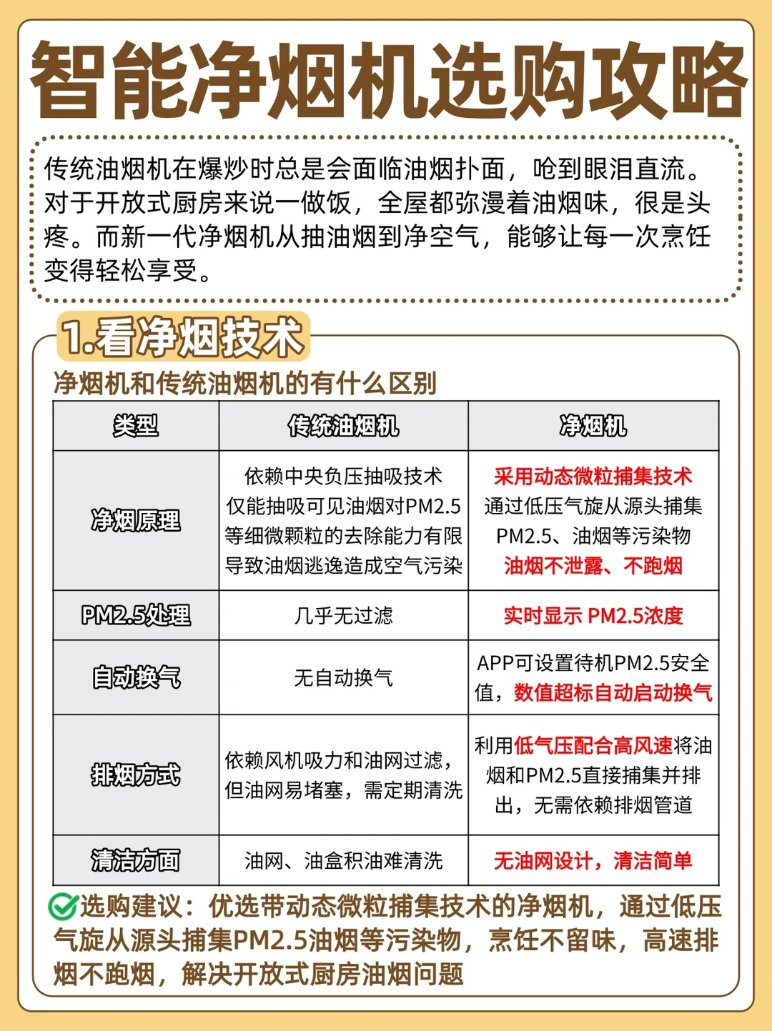 优选带动态微粒捕集技术的净烟机,通过低压气旋从源头捕集PM2.5、油烟等污染物,烹饪不留味,高速排烟不跑烟,彻底解决开放式厨房油烟问题