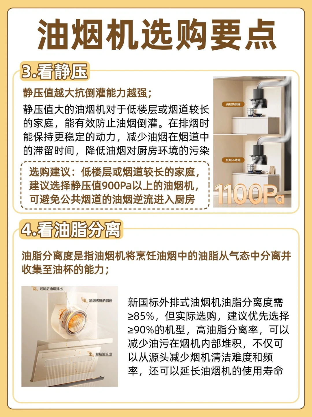 低楼层或烟道较长的家庭,建议选择静压值900Pa以上的油烟机,可避免公共烟道的油烟逆流进入厨房