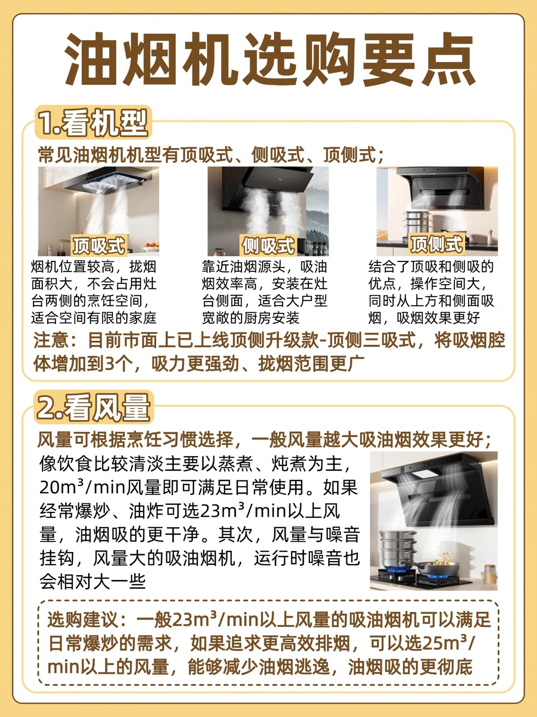 一般23m³/min以上风量的吸油烟机可以满足日常爆炒的需求,如果追求更高效排烟,可以选25m³/min以上的风量,能够减少油烟逃逸,油烟吸的更彻底