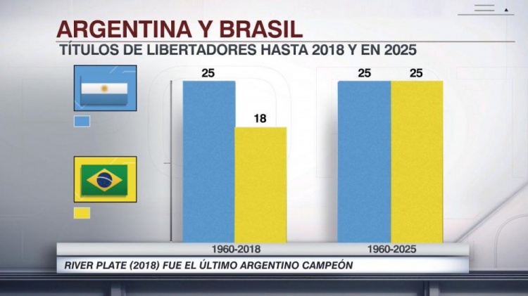 据ESPN统计,截至2018年阿根廷球队25次夺得南美解放者杯冠军,巴西球队18次夺冠。