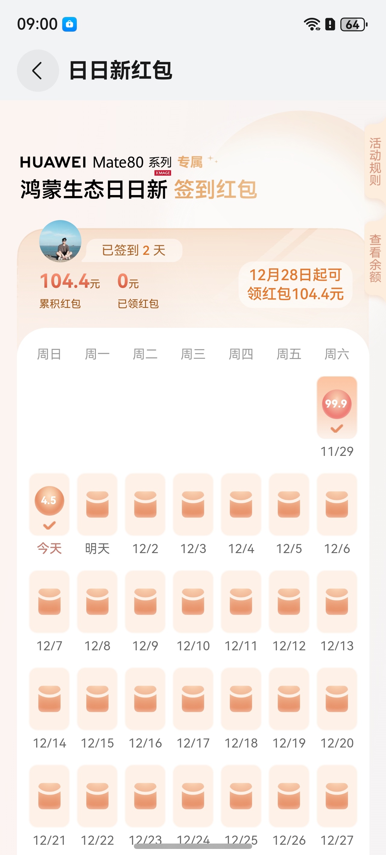 好家伙鸿蒙日日新红包这么刺激吗第一天就是99.9大🧧这每天攒下来回血不少还有6个月免费会员都记得领
