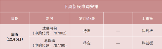 根据最新发行安排,下周有2只新股申购,均为科创板新股,申购日期均为12月5日。
