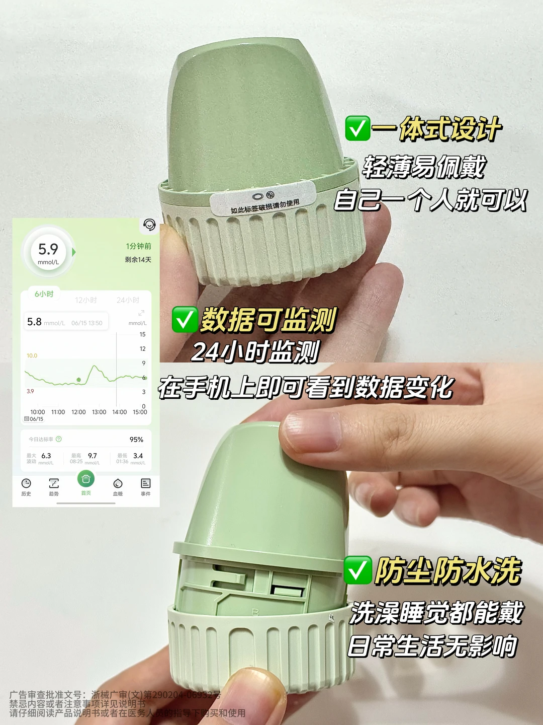 [星R]相比传统的血糖仪需要每天扎手指,动态血糖仪是一体式的,黏在手臂上就行,用一次能够管半个月,并且血糖数据监测也更精准,基本上每分钟都会实时监测,从而行程连续的血糖曲线,从而查看血糖的变化,而且能够防尘防水,洗澡出汗都不受影响~