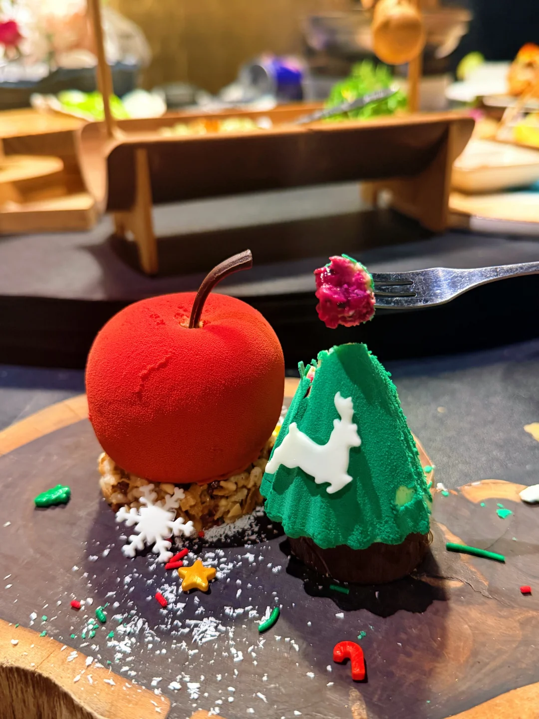 限定的圣诞甜品看到就疯狂心动的程度!丝绒蛋糕做成的红苹果🍎和圣诞树🎄造型,切开是火龙果流心,仿佛在拆圣诞礼物🎁的幸福感!味道好吃又不会太甜。