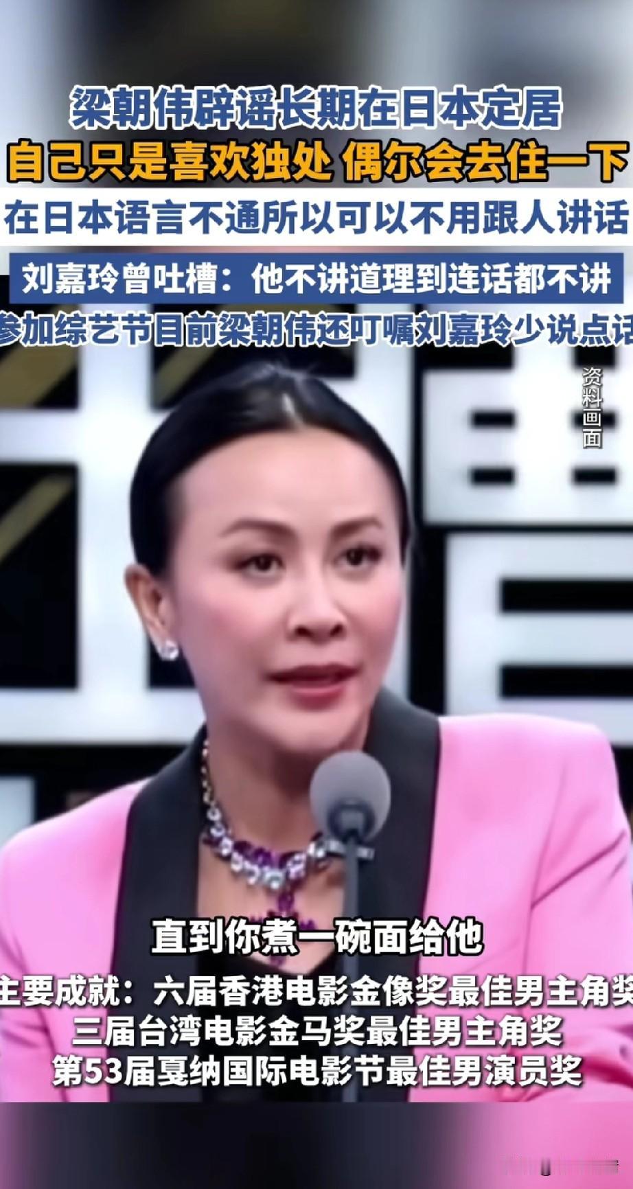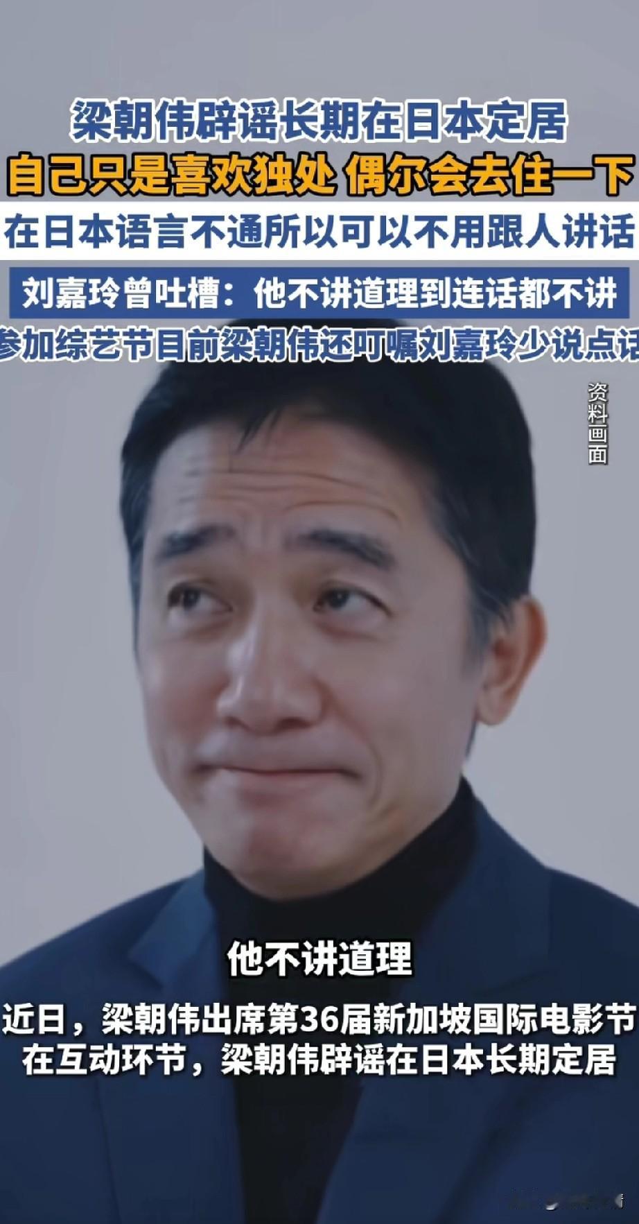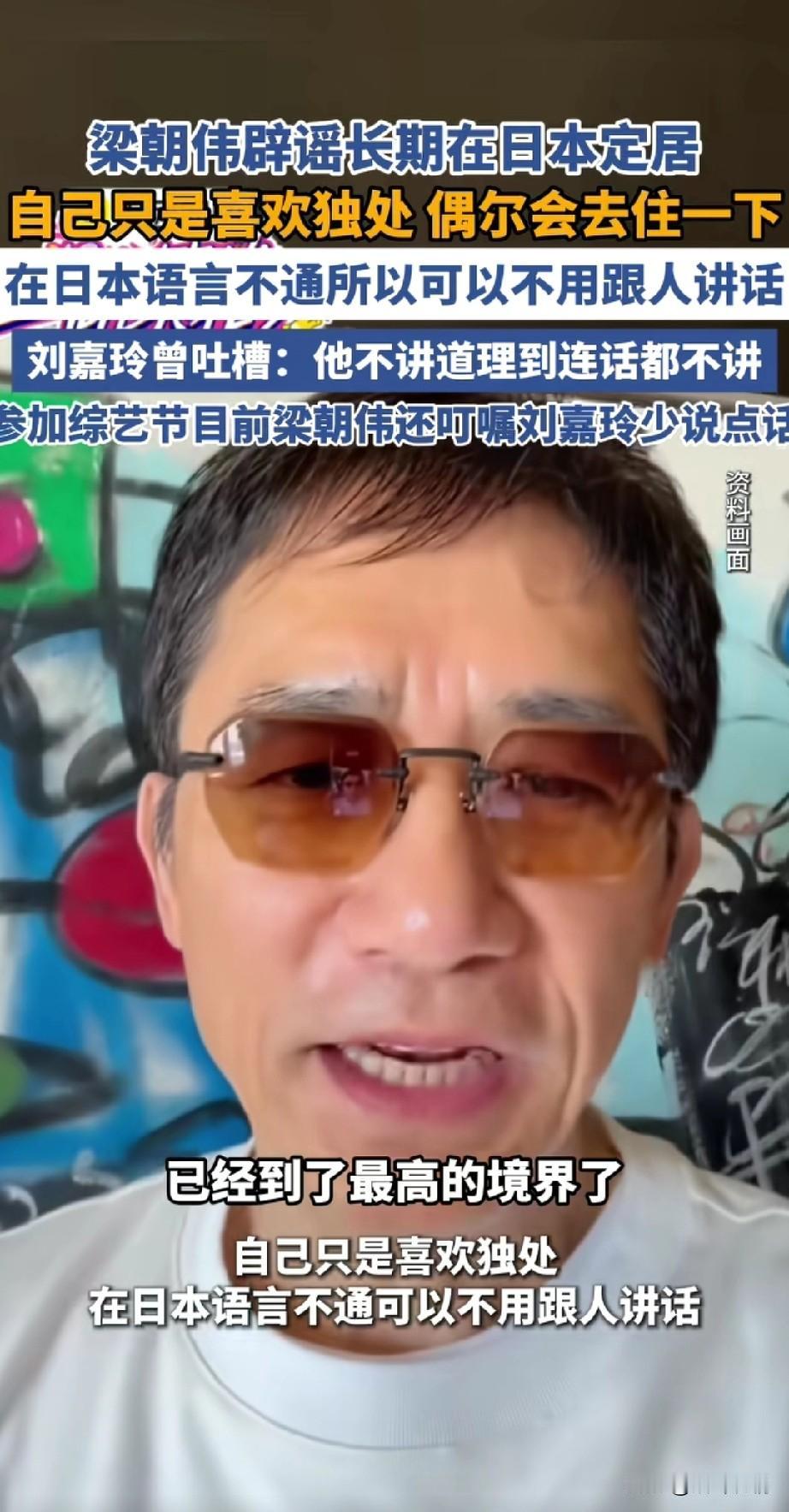 梁朝伟辟谣长期居住在岛国, 自爆自己岛国居住的原因, 竟然是想自己安静一下, 在那里没有人认识他, 这样的觉得很舒服, 他不会将日语, 这样在岛国就不用和其他人讲话了, 他的老婆刘嘉玲上综艺的时候, 表示梁朝伟不讲道理到都不讲话了, 直到你煮一碗面给他吃! 这可逗笑了在场的所有观众, 在影视圈梁朝伟绝对全是影帝人物, 他参演了许多作品, 大家都看过他的很多作品, 不知道是不是演戏多了, 见过太多人的复杂性, 就不想和别人讲话了, 追求修身养性了! 大家觉得梁朝伟为什么不喜欢和人讲话? 梁朝伟 工地梁朝伟 刘嘉玲 刘嘉玲那点事
