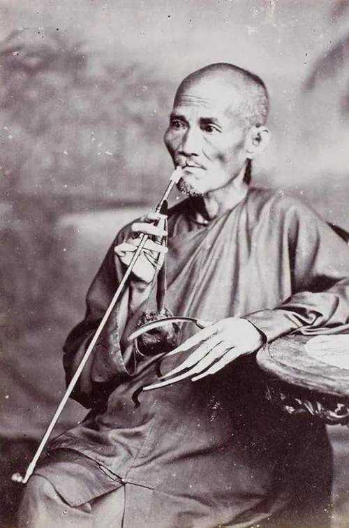 晚清至民国初年,一老者虽身患兔唇,却难掩矍铄的精神气,须发已染遍花白,身形清瘦却腰背舒展,正噙着一杆长旱烟轻吸,烟杆色泽温润、烟袋铜锅泛着旧光,姿态闲适得很。 最醒目的是他左手那几枚纤长的指甲——弧度匀整、长度惊人,显然是常年精心养护的结果,这在劳作是生计常态的年代,本就是“无需经手粗活”的身份证明;再看他身上衣料虽色调沉敛却质感规整,加上这张需耗费不少银钱的上色肖像照,更直白地显露出他优渥的家境:毕竟当时多数平民连温饱都难周全,既养得起这般长指甲,又能留下影像的人家,绝非普通门户。
