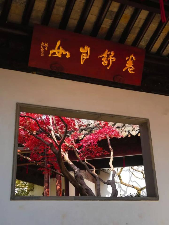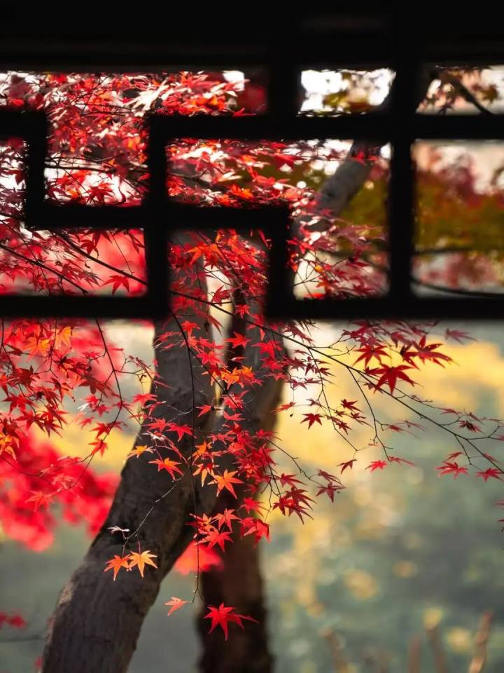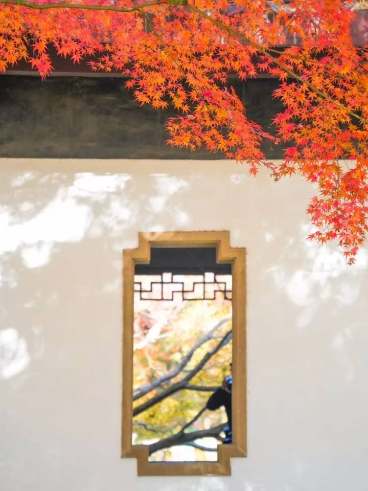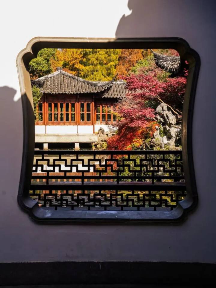 从镂空的窗格间望出去,亭台楼阁、树树红叶嵌入其中,像一幅幅被精心装裱的写意画,秋冬的繁华与寂寥,在画框中悄然合一。