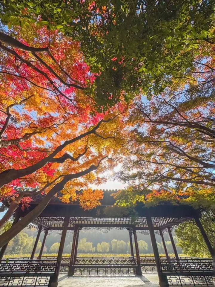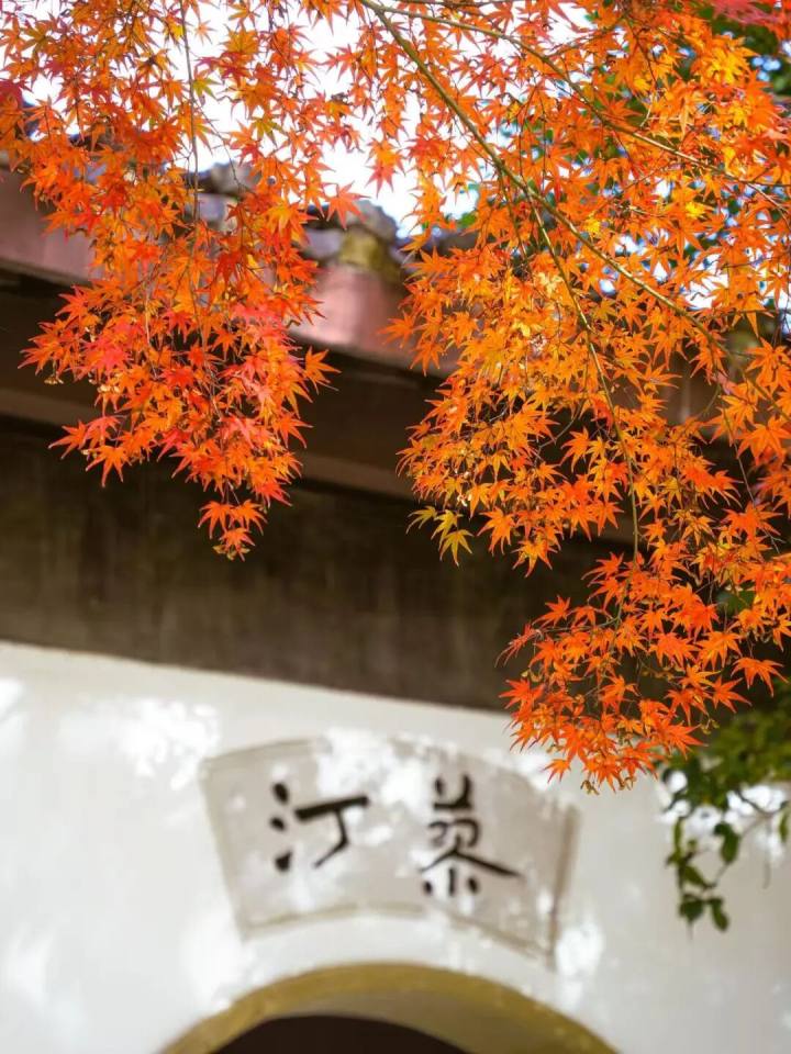 门洞、亭子、红枫三点一线,构成了一幅绝美的秋景图。