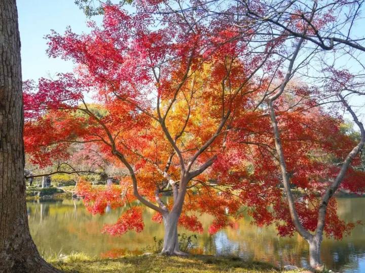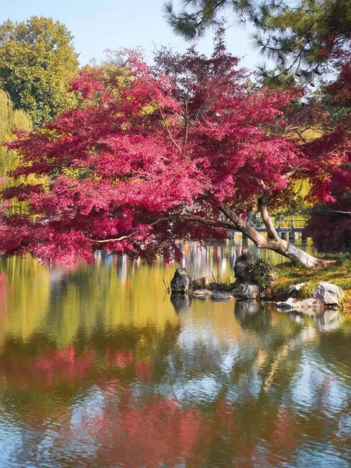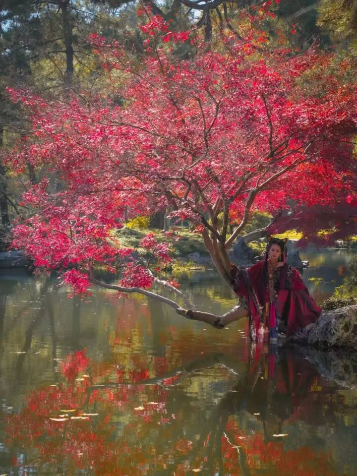 特别是那些斜生在水边的枫树,树干探向湖面,红叶低垂,与水中的倒影连成一片。