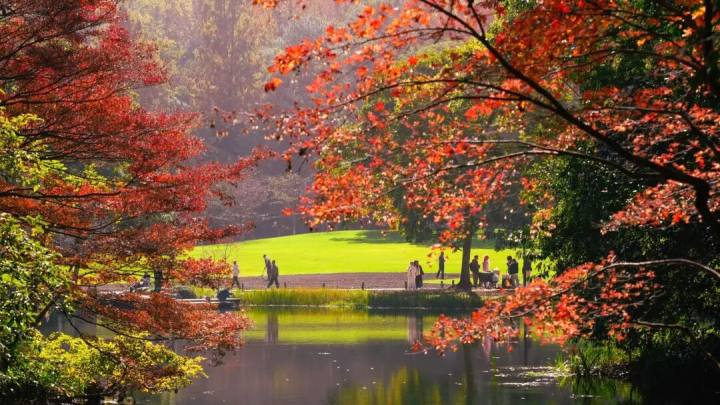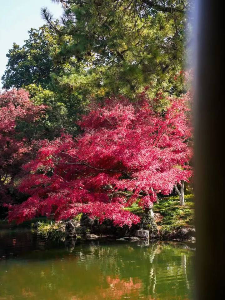 站在公园外水岸这一头,隔水望向对岸——两株红枫恰好作前景,后面是依旧青翠的草坪,再远处是深绿的树影。