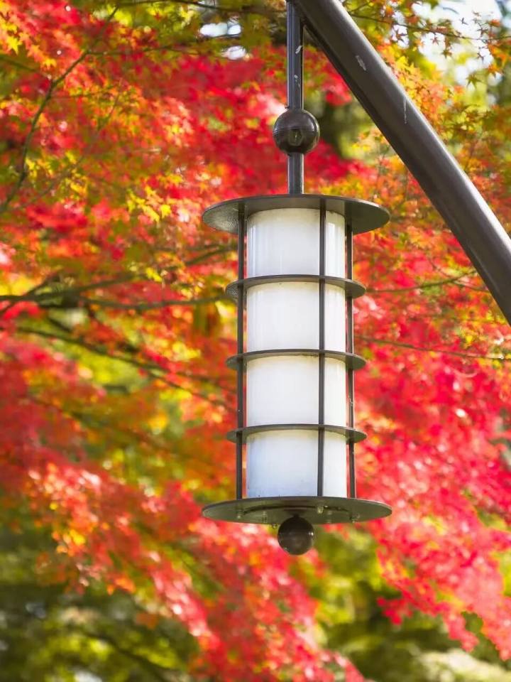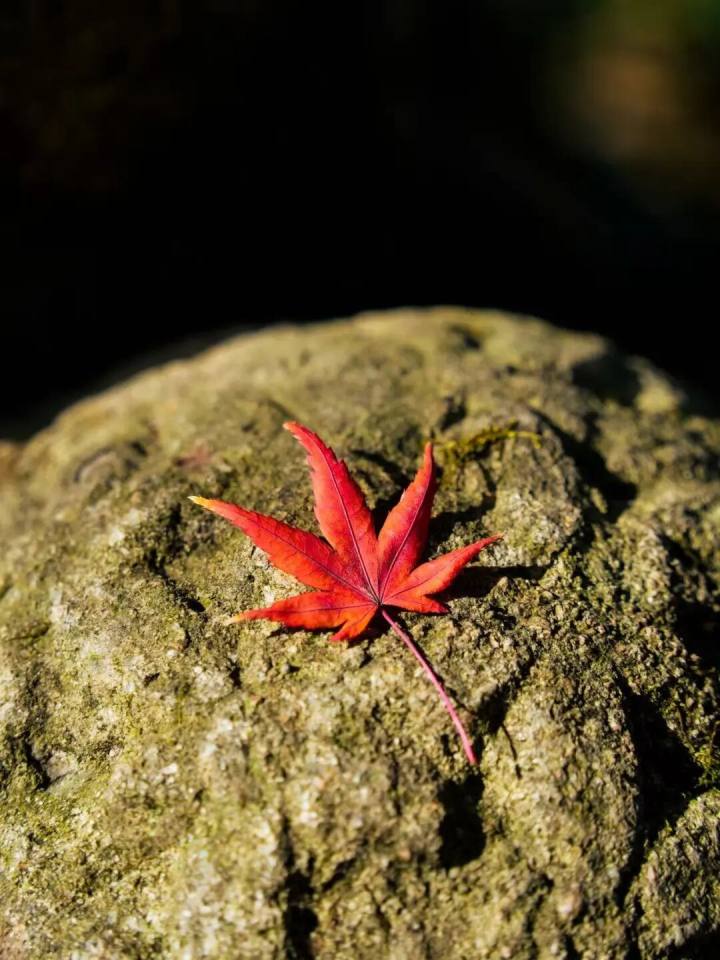 站在亭外举头望,阳光把红枫映得透亮;而亭内的枫树叶子却已焦枯,一内一外,仿佛时光在这小小空间里被同时按下快进与暂停。