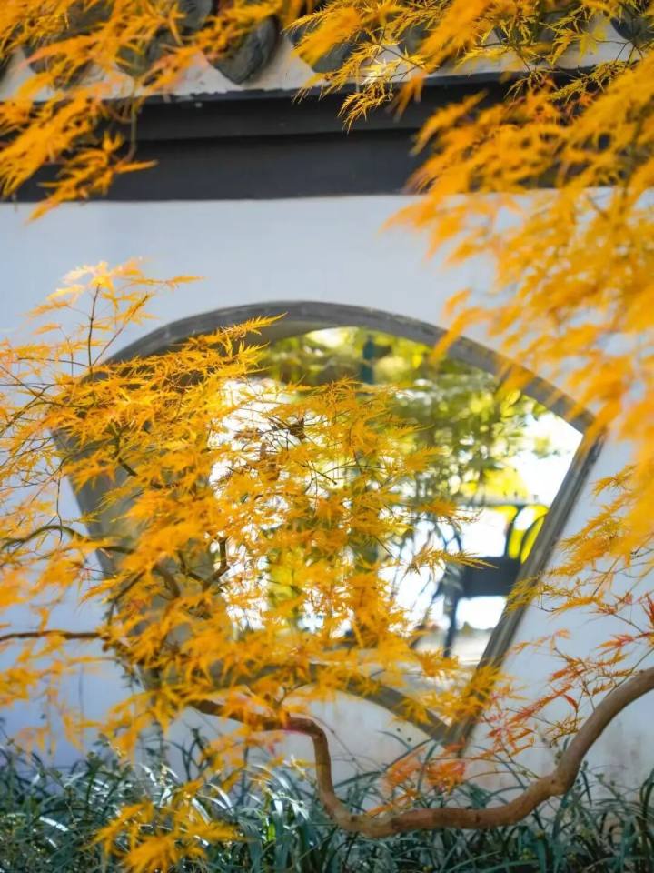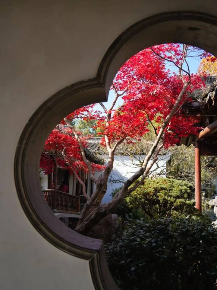 虽池边有株枫树叶子已近凋零殆尽,可园内的花窗却成了绝佳的取景框——