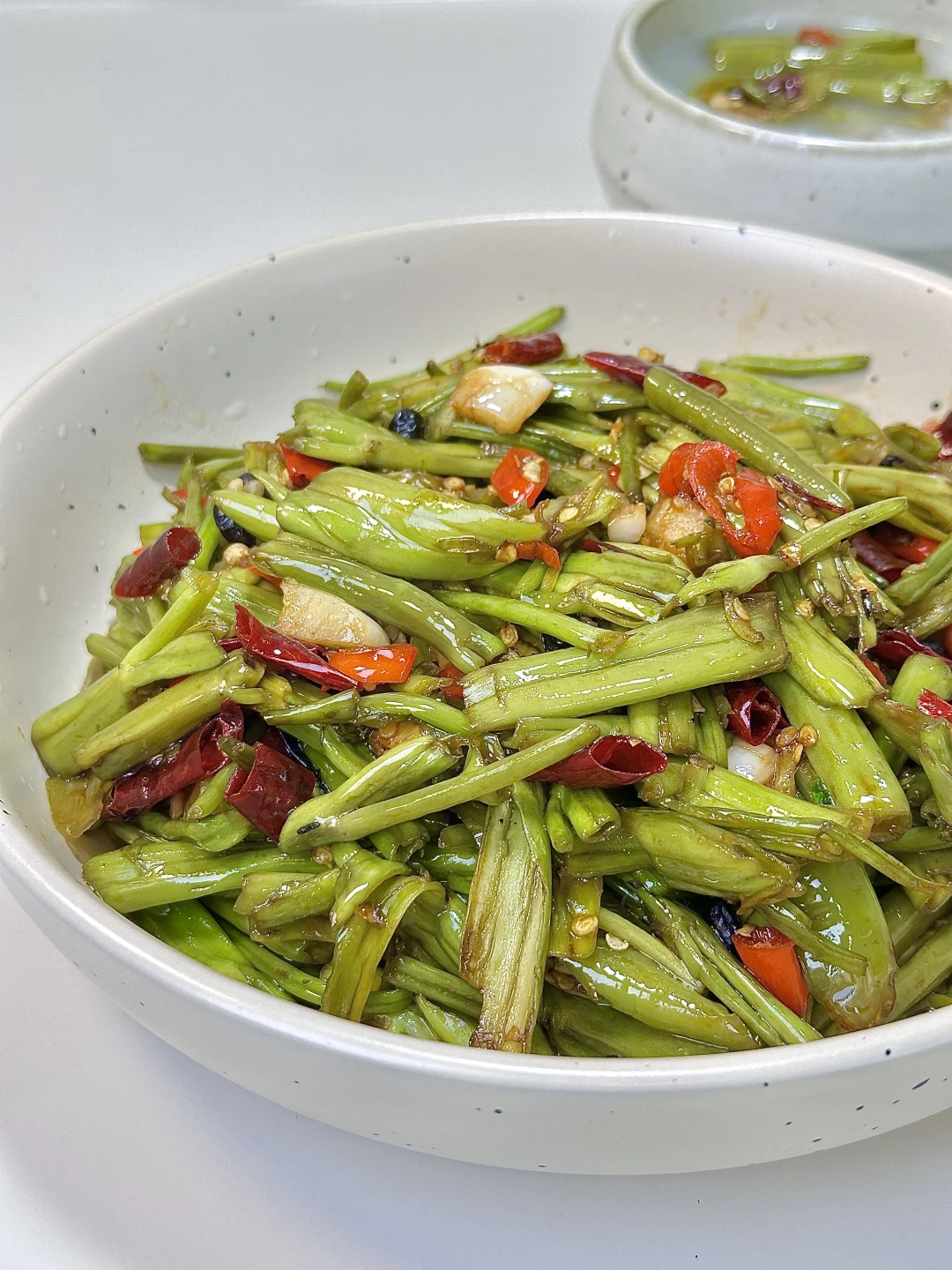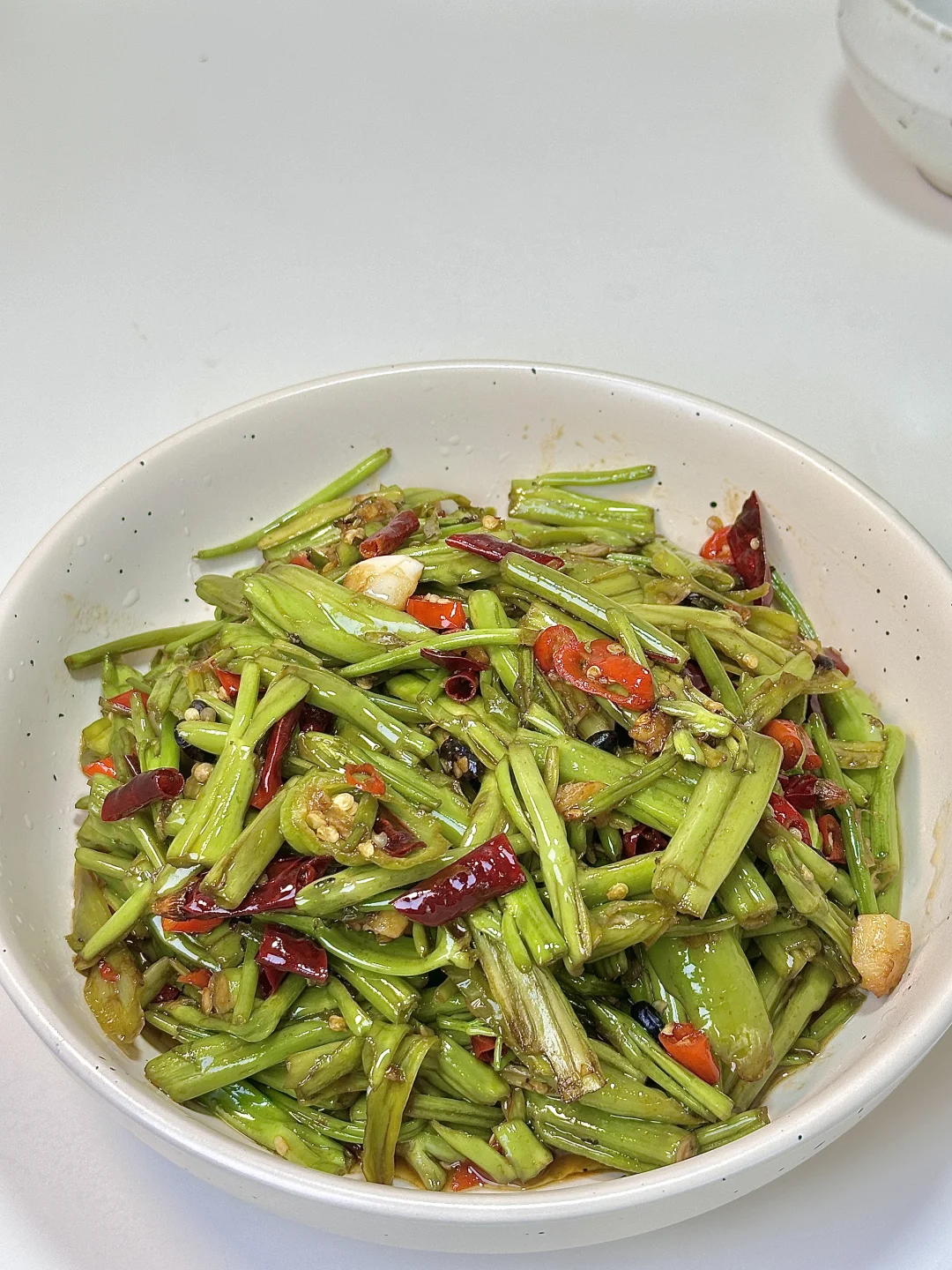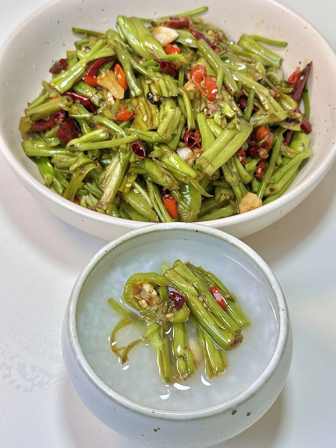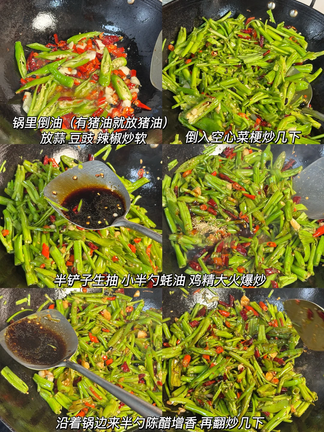 脆嫩香辣 下饭下粥一绝[哇R]应该每个江西人从小到大吃不腻吧[偷笑R] ✨食材:空心菜梗 蒜🧄 豆豉 干辣椒 小米椒 青椒 1️⃣:空心菜梗用刀背拍扁,再切段,放碗里加盐抓捏一分钟,里面会出水 把水倒掉。锅里倒油烧热 放蒜 豆豉 辣椒炒断生,放空心菜梗炒几下,加半铲子生抽 半勺蚝油、鸡精爆炒入味,起锅前沿着锅边来点陈醋增香丰富口感 再炒几下就可以啦。 好好吃饭呀🖖🏻