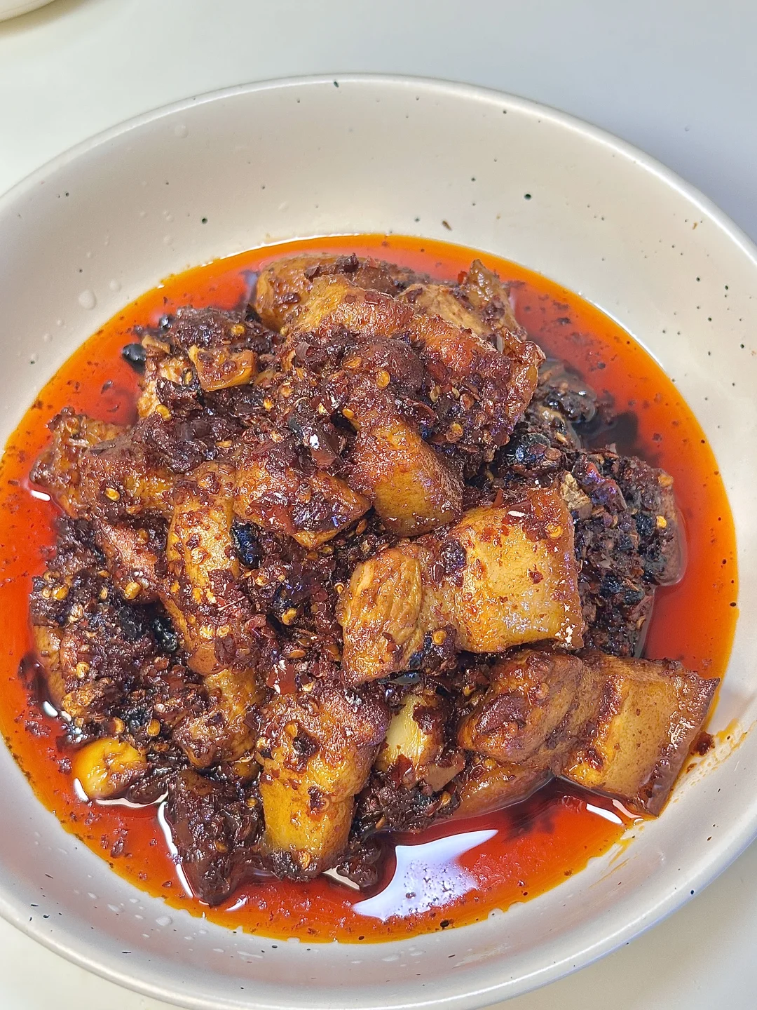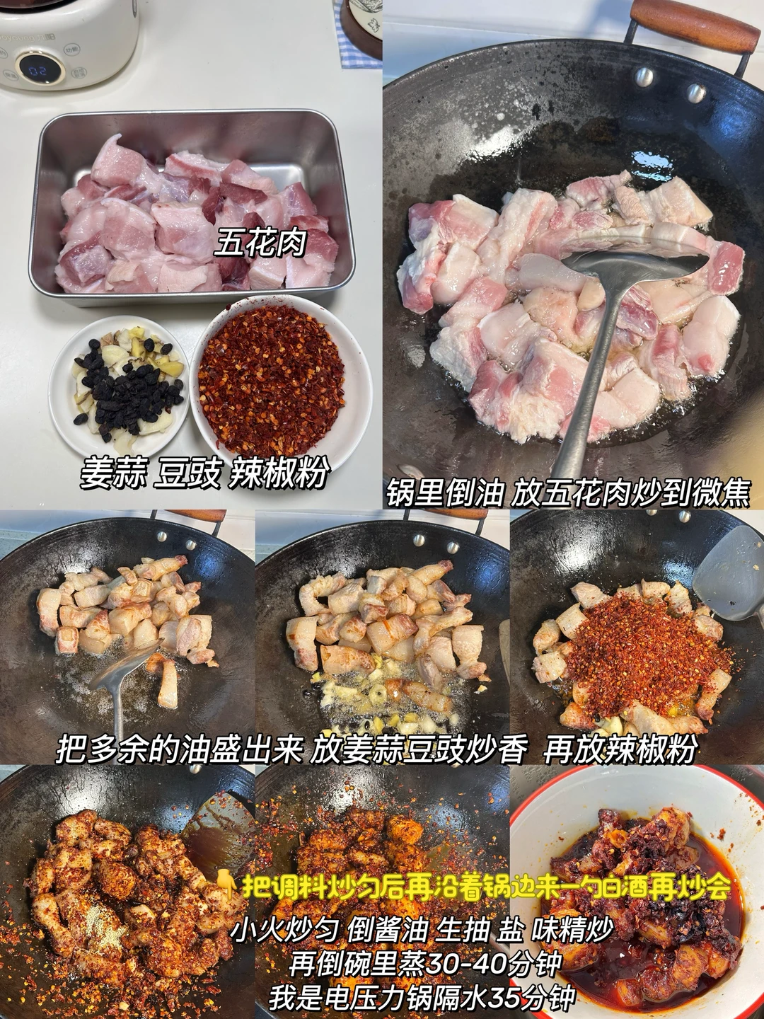 蒸五花肉 江西做法 香辣可口 ,软糯不柴,这个菜蒸的越久越好吃🤤 ✨食材:五花肉 姜蒜 豆豉 辣椒粉 1️⃣:五花肉切块用面粉抓一会儿去除腥味,再清洗干净沥干水份备用。锅里倒油放五花肉中火炒到微焦(大火炒久了瘦肉会柴)把多余的油盛出来,放姜蒜豆豉爆香,再放辣椒粉转小火炒均匀。 2️⃣:调味加生抽 酱油 盐 味精,再沿着锅边来一勺白酒炒一会儿。盛到碗里 用电压力锅隔水蒸30-40分。如果是电蒸锅推荐蒸60分钟左右。 好好吃饭呀🖖🏻