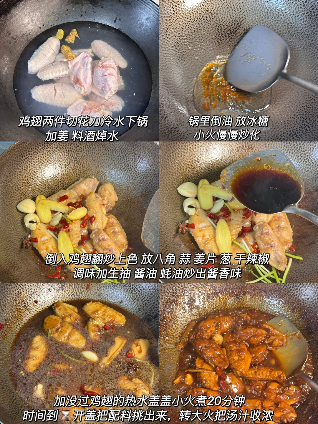 1️⃣:鸡翅用手沿着中间的骨头挤出血水冲洗干净,再用清水泡一会(赶时间就用面粉抓洗一下)冷水下锅加姜片,料酒焯水。水开后夹出来擦干净水分。锅里倒油 放一小把冰糖最最小火慢慢炒化,颜色变深黄后就关火继续搅拌,换成枣红色后放入鸡翅炒匀。