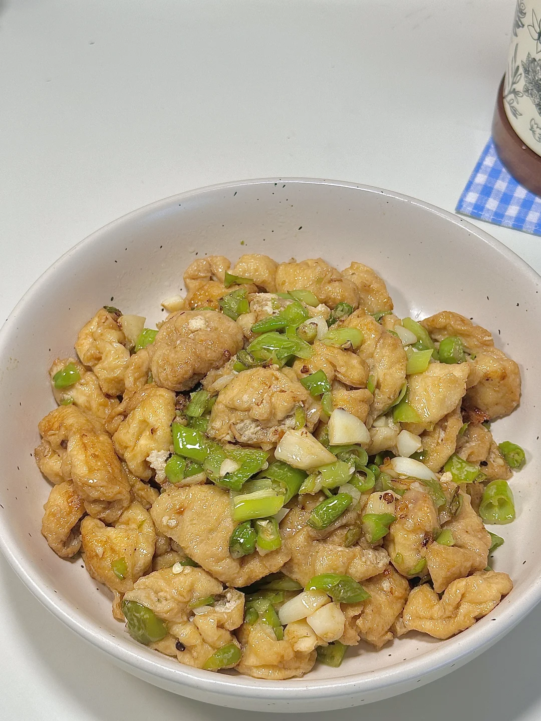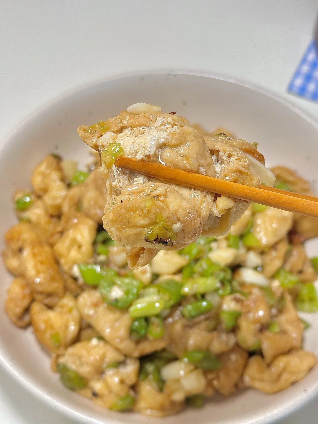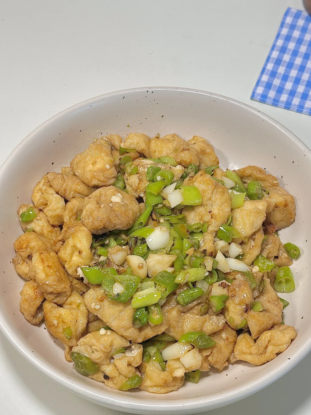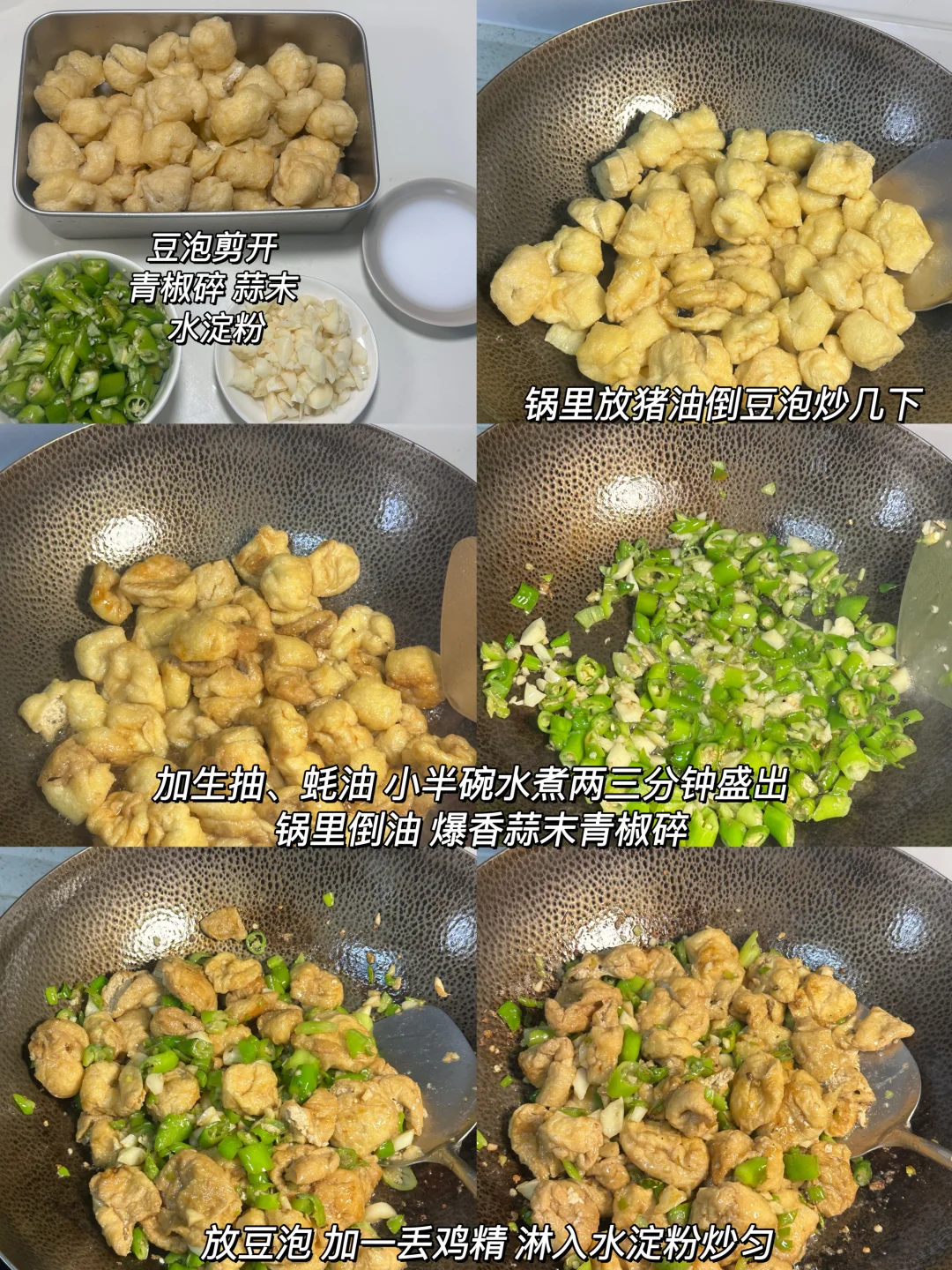 青椒炒豆泡 豆泡一口爆汁,今天买的青椒又嫩又辣,鲜辣味焖进豆泡里 好下饭 热气腾腾的三餐 ✨食材:豆泡 青椒 蒜末 1️⃣:豆泡剪开不要剪断,青椒蒜末切碎。锅里放猪油烧热倒入豆泡炒一会儿,加蚝油 生抽,小半碗水煮两三分钟盛出,锅里重新倒油 放蒜炒香,再倒入辣椒炒断生。 放豆泡炒几下,加一丢鸡精 淋入水淀粉大火炒匀。 觉得味道不够的出锅前可以加点盐🧂 好好吃饭呀🖖🏻