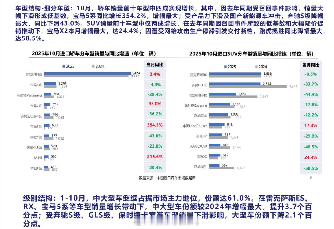 据乘联会发布的2025年10月中国进口汽车市场月报数据来看,进口车大部分都是出现下滑,但是还是有少部分车型增长幅度很大!2025对比2024年,基本都是2位数下滑了,看看明年又会如何汽场全开新能源汽车进口汽车乘联会