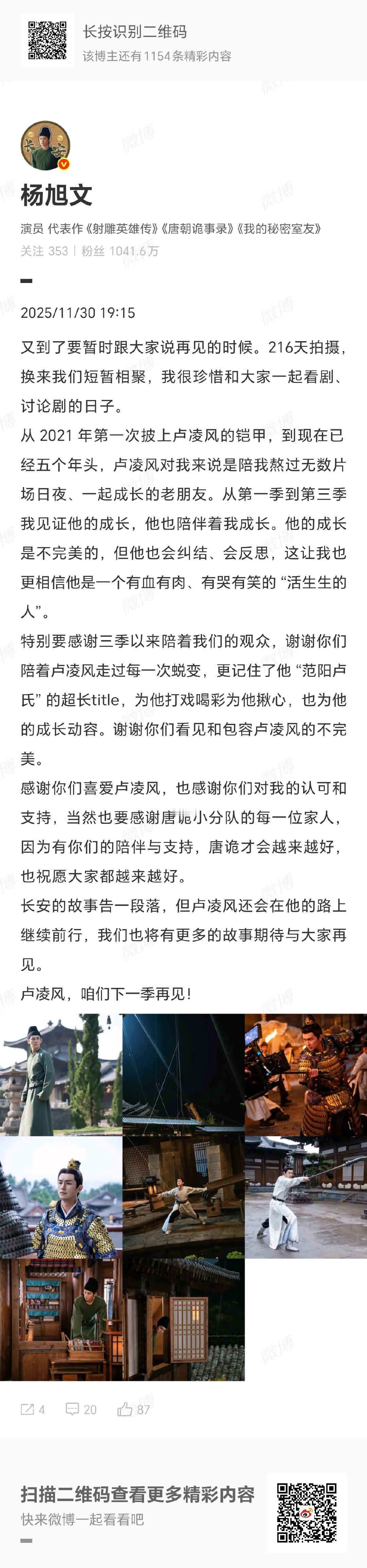 杨旭文发长文告别唐诡3 杨旭文又到了要暂时跟大家说再见的时候杨旭文发长文告别唐诡