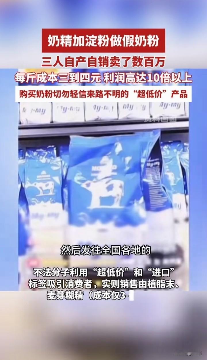 气愤,有些人为了自己的利益,居然对奶粉下手,不知道他的良心是不是很坏很坏。 近日央视节目报道某地三个人用奶精加淀粉做成假奶粉,自产自销卖了数百万。每斤的成本只有3到4元。利润高达10倍以上,有点冒充羊奶粉在各电商平台售卖。 说实话作为消费者很难去辨别什么样的奶粉才是合格和放心的奶粉。 在这里提醒大家,买奶粉不要贪便宜,要到正规的商店去购买,出了问题也可以得到解决。 希望对那些售卖假东西的人,必须严惩不贷。 你们怎么看那些卖假奶粉的人呢?