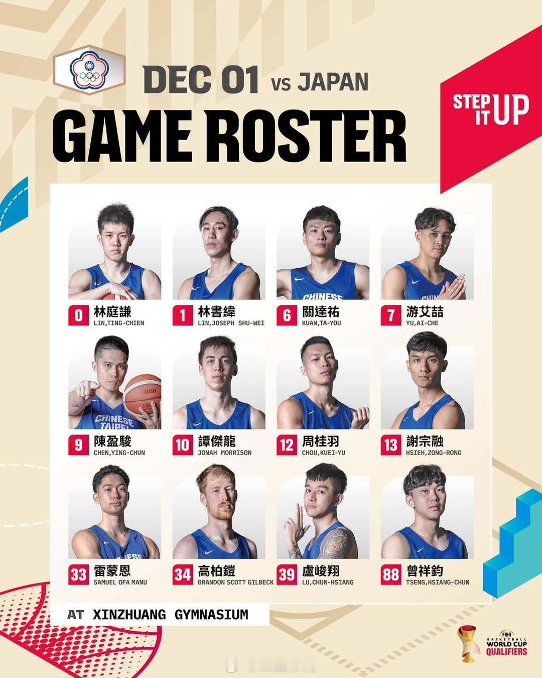 中国男篮 同组12月1日场,两队12人名单公布。日本队没有换人,中国台北队换了两人,林秉圣和阿巴西被关达佑、潭杰龙替换。【12月1日战名单】日本队名单:齐藤拓実、富坚勇树、安藤誓栽、渡边雄太、马场雄大、西田优大、霍金森、富永启生、原修太、渡边飞勇、吉井裕鹰、川真田纮也中国台北队名单:陈盈骏、林庭谦、关达佑、游艾喆、林书纬、潭杰龙、卢峻翔、周桂羽、雷蒙恩、曾祥钧、谢宗融、高柏铠