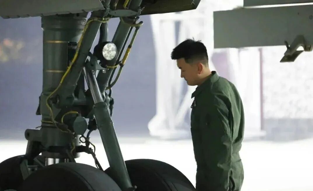 机务准备工作就绪后,飞行员接收飞机,进行绕机检查,井然有序做好战机出击前准备工作。