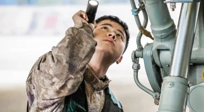 机务官兵手持工具,按流程“充填加挂”检测油液、对接管路、测试操纵杆、方向舵灵敏度,核对氧气压力、复查雷达数据,展开机务准备工作。