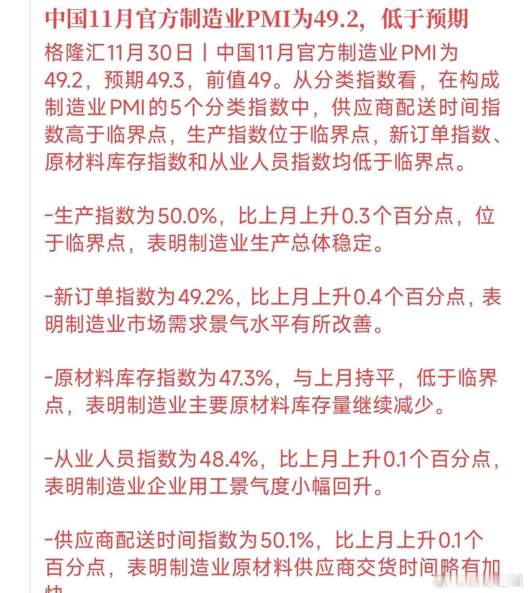 制造业指数和非制造业指数出炉,双双不及预期从官方发布的11月制造业指数来看,PMI49.2,虽然不及预期的49.3,但是主要低于临界点的在于新订单,原材料和从业人员,但和上月相比都有所上升,并不影响制造业。非制造业指数PMI49.5,预期50。主要就是房地产行业和居民服务等低于临界值,尤其是服务业下降的比较多,10月还是50.2,11月仅仅49.5,建筑行业相较上月还有所增加。从以上数据基本可以看出对于制造业来说是一个利好,但对于非制造业来说是一个利空,尤其是服务业,服务业的下降主要还是因为消费行业的不景气,消费的政策可能还会有很大预期。