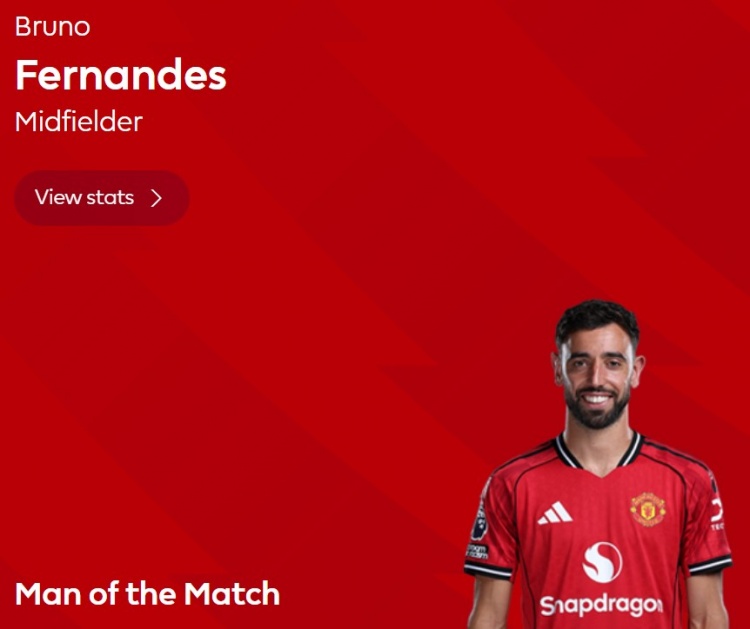 本场比赛B费助攻双响发挥出色,赛后他也当选英超官方球迷票选本场最佳球员。
