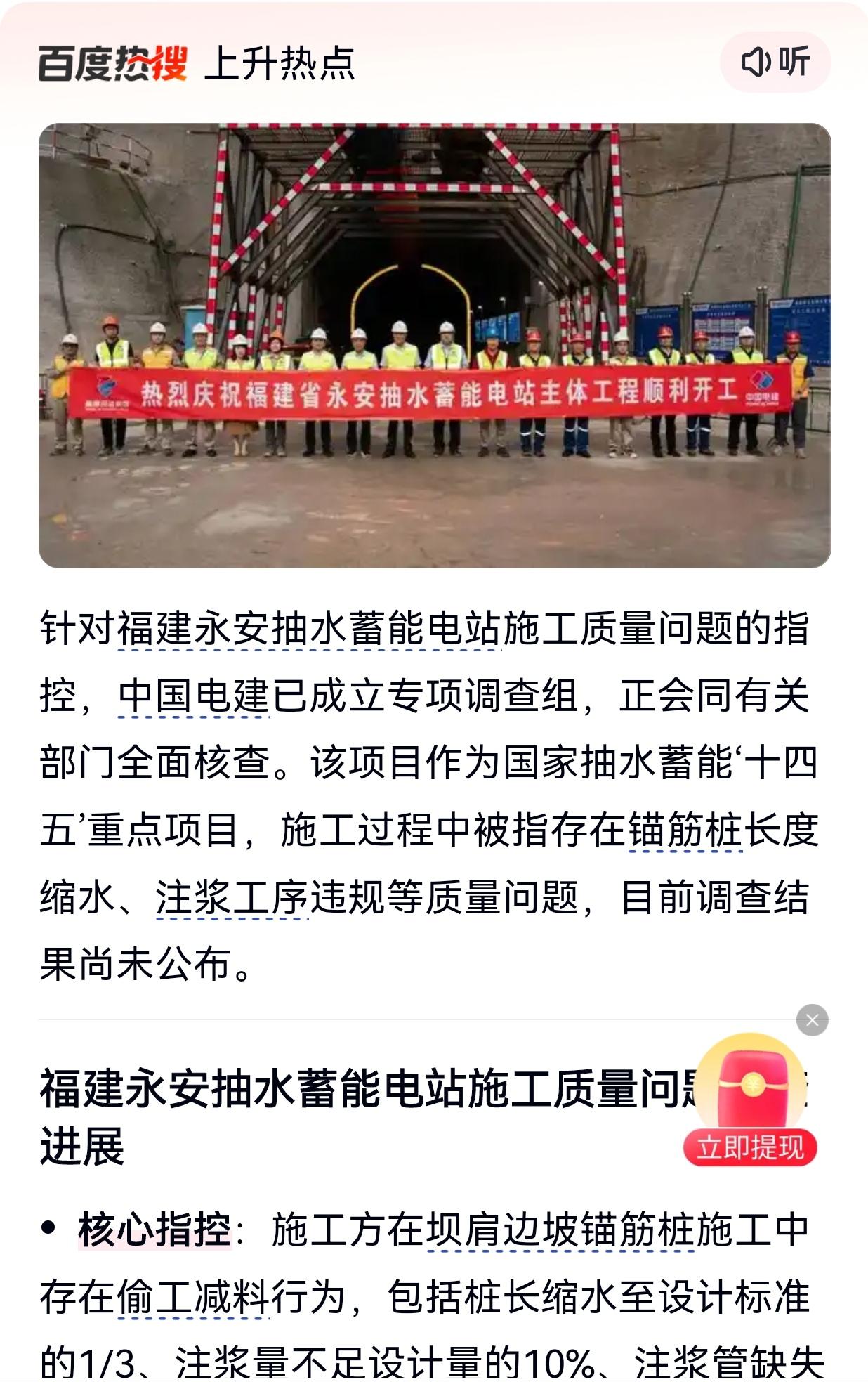1月30日消息,中国电建已经针对媒体反映福建永安抽水蓄能电站施工过程中存在的锚筋桩长度缩水、注浆工序违规等质量问题成立调查组。 其中,该事件中承建单位是水电三局和水电十六局,而监理单位华东咨询公司却是项目设计方华东勘测设计院的全资子公司,三方均隶属中国电建体系,这样的“肥水不流外人田”的监督、监管模式引发大家对该项目关于独立性质疑!