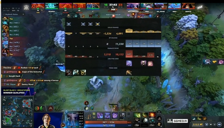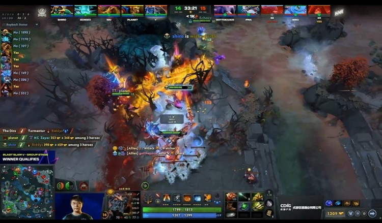 [19分钟]planet蝙蝠骑士拉gotthejuice虚空,shiro哈斯卡接大招输出打满,终于秒了虚空。可惜回头Niku帕克沉默控到Echozz蓝猫,蓝猫被击杀,双方经济一直没有拉开。