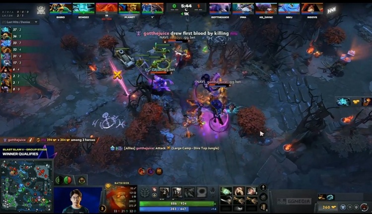 [35分钟]Echozz蓝猫飞高地先手,这次Navi的人都在,蓝猫羊了一下gotthejuice虚空,但虚空第二时间入场还是正面刚过了shiro哈斯卡,pma大鱼人一脚踩三人留人,Tidebound被打一波四人阵亡。