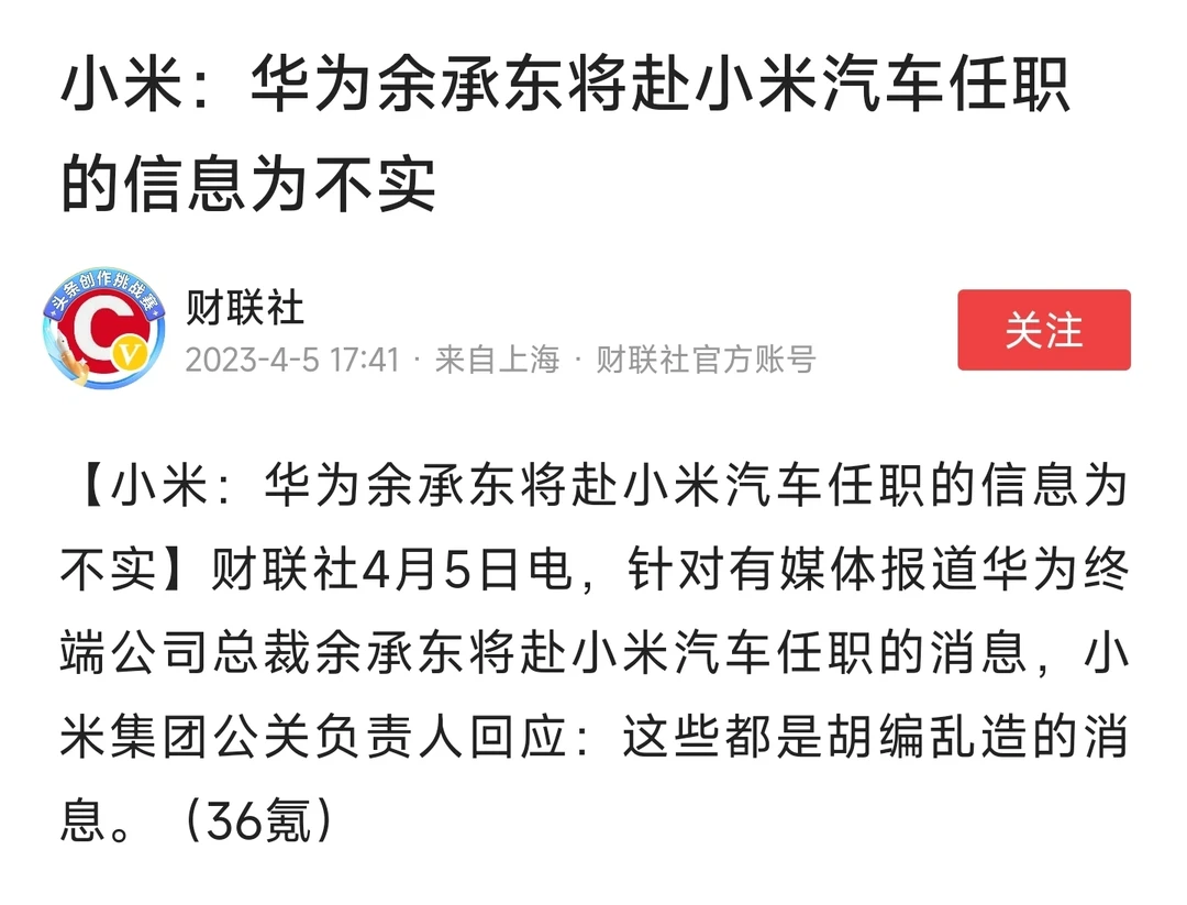 尘埃落地,小米辟谣:余承东加入小米任职,没有的事。说实话,还挺遗憾的,余承东的实力有目共睹,小米求才若渴,双剑合璧,高端国产手机的春天不就来了吗?苹果将难再一枝独秀。
